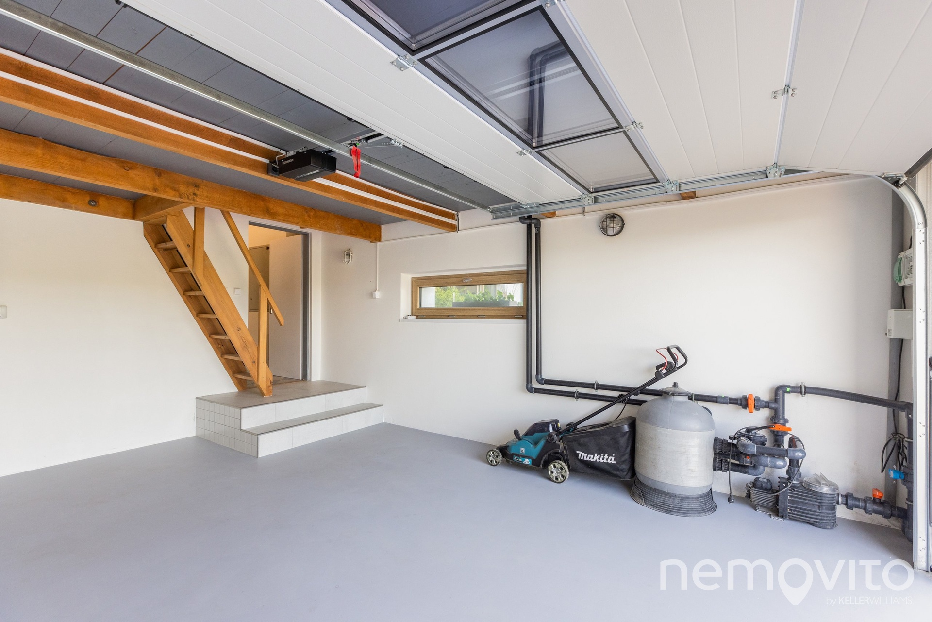 Technické zázemí je umístěno u vstupní chodby - tvoří ho samostatná prádelna (8 m2), dále čtvrtá koupelna a také místnost s technologií (FVE, akumulační nádrž atd.). Garáž s vysokým stropem umožnila vybudování vestavěného patra pro zvětšení objemu úložného prostoru, který je dále doplněn o sklípek u bazénu.