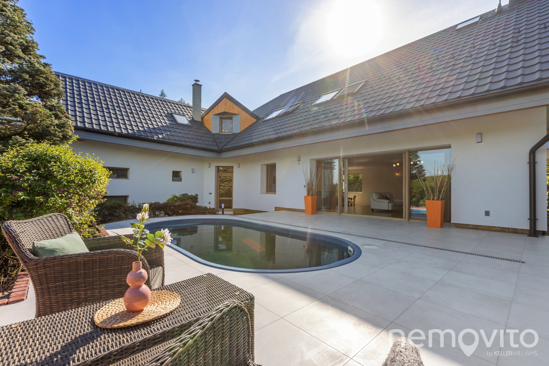 Dvoupodlažní stavba s obrovským obývákem (110 m2) nabízí skoro 300 m2 plochy s garáží, velkou půdou, malým sklípkem u bazénu a 4 koupelnami. Nechybí také řada úložných prostor v podobě technické místnosti nebo velké prádelny. Typická velkorysost domů z přelomu milénia, která však netrpí vysokými náklady na provoz. Dům je totiž zejména v letních měsících dle výpočtů PENB na hraně soběstačnosti (teoretická spotřeba 1 kWh na 1 m2 za rok).