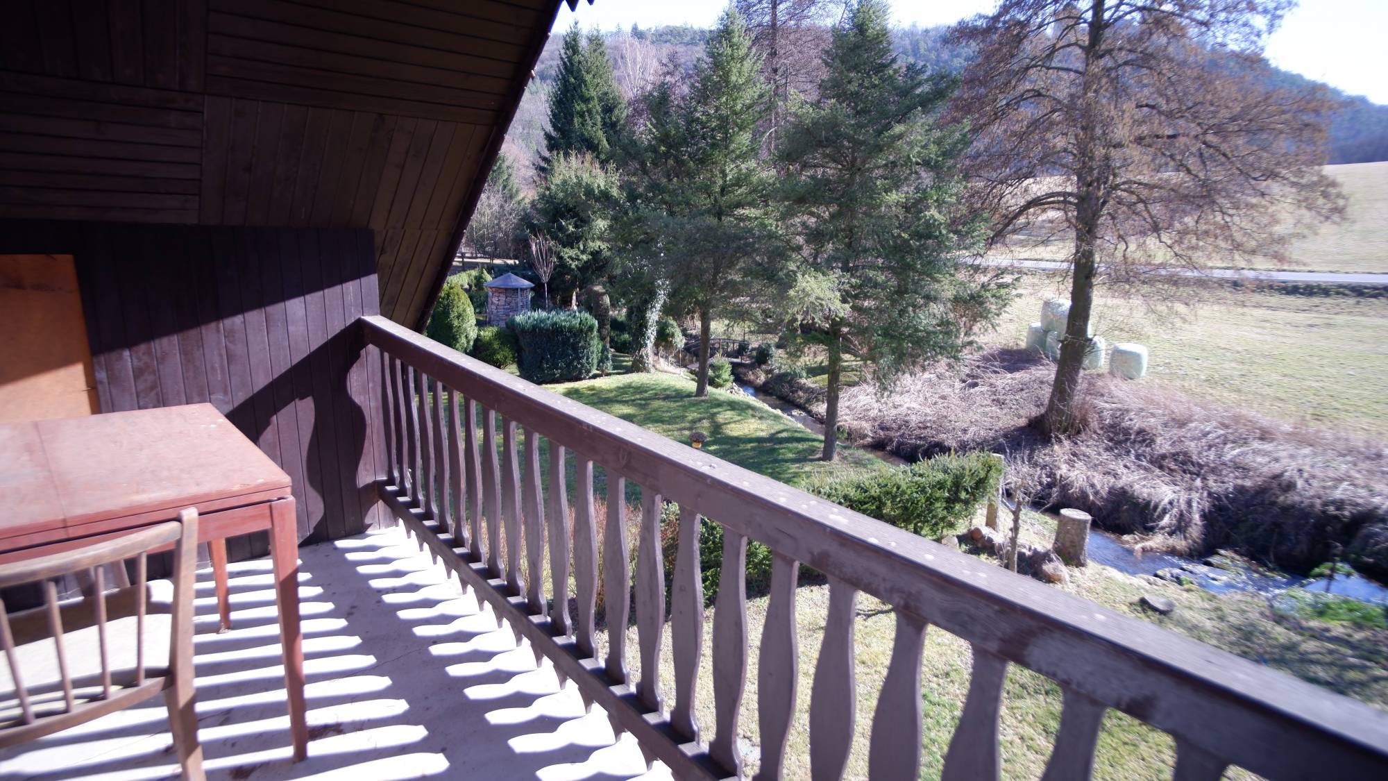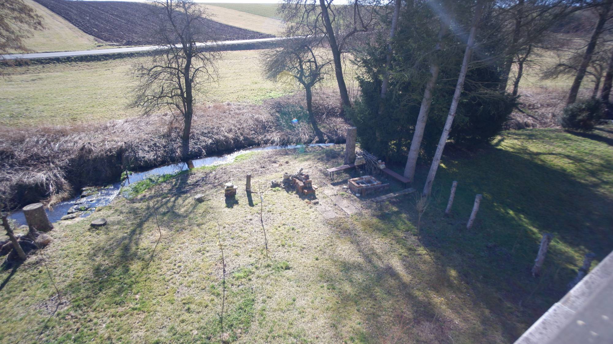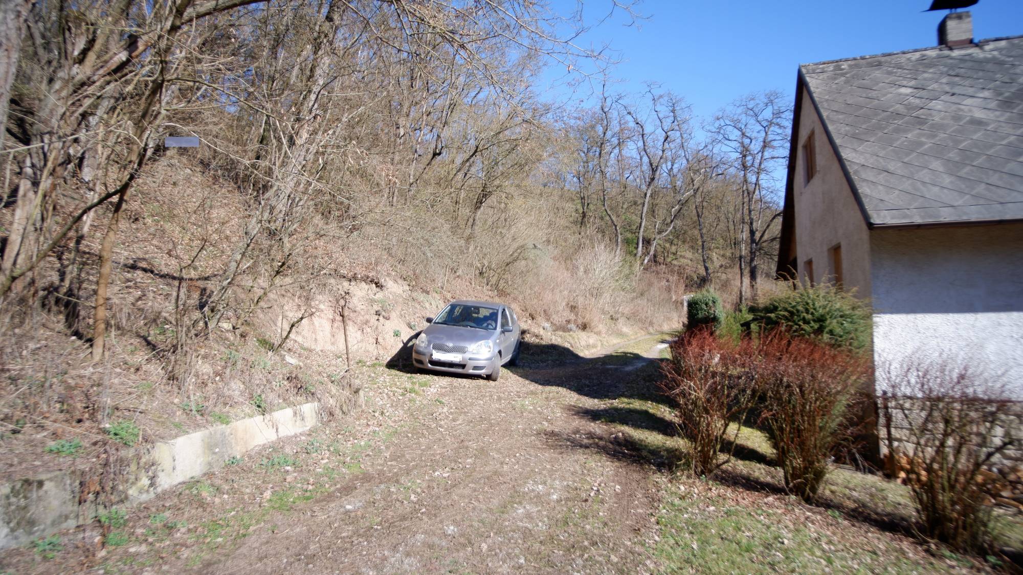 Zahrada o výměře 278 m² je ohraničena potokem, okolní zeleň a stromy vytvářejí přirozené soukromí a z pozemku se otevírá kouzelný výhled na hrad Točník.