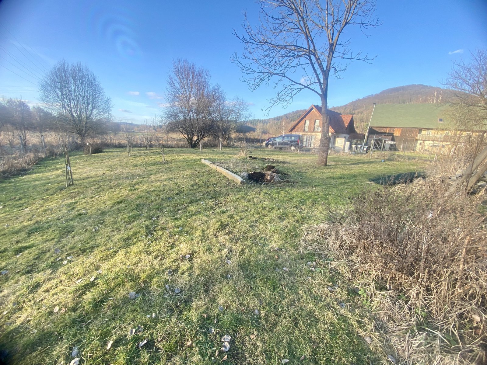 Na pravé straně jsou připravené (částečně nedokončené) záhony.