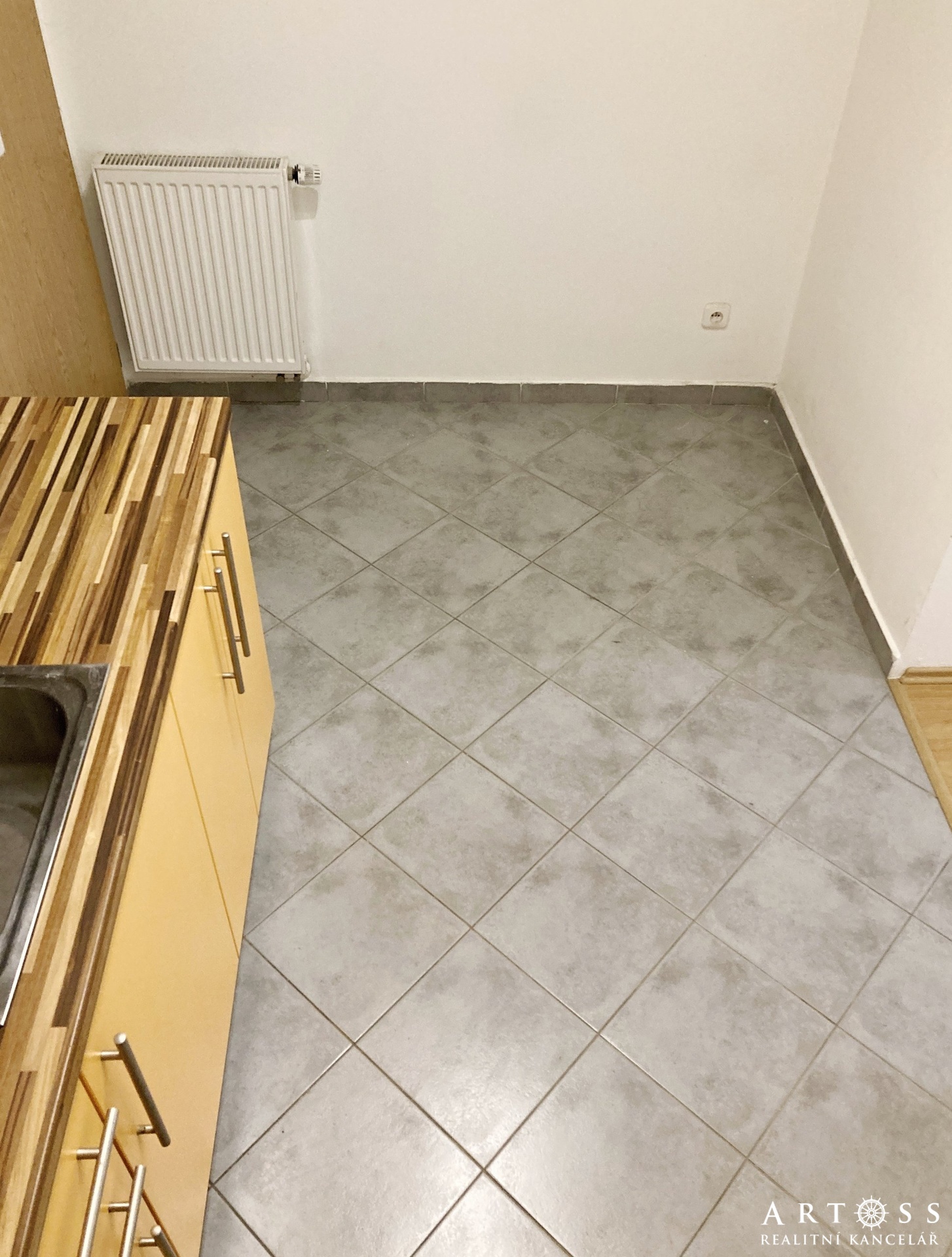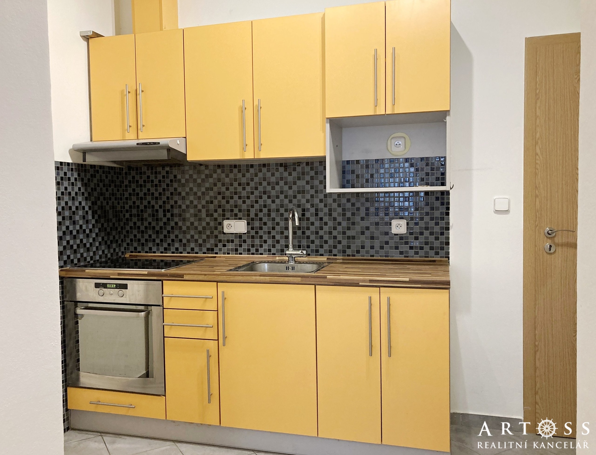 Kuchyně je oddělena od obývací části a je vybavena KL, troubou, digestoří a lednicí, stolem a židlemi. Obývací pokoj je nevybavený. V oknech jsou žaluzie.