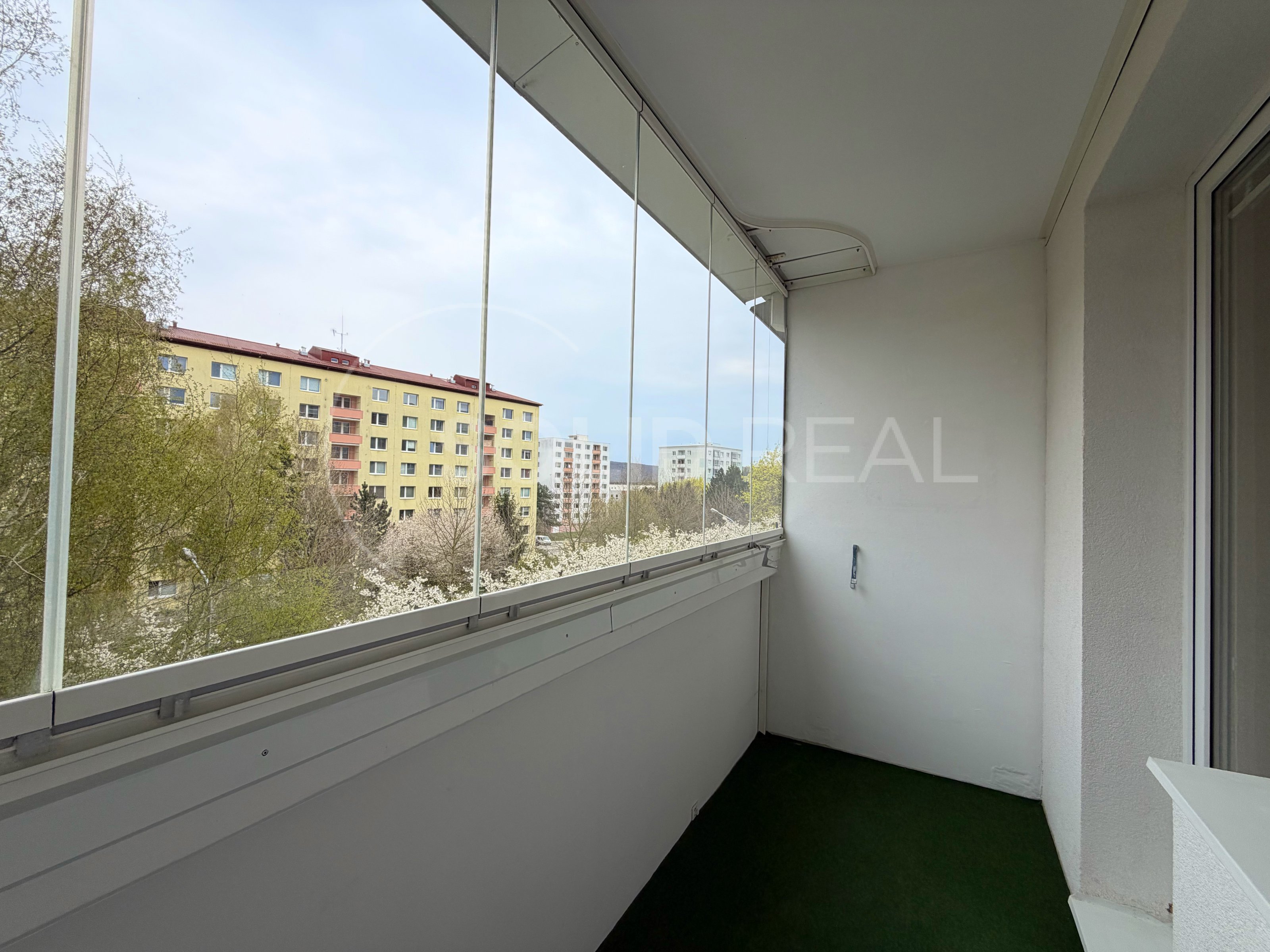Lodžie: Velká, kompletně zasklená lodžie s výhledem do zeleně a okolní zástavby – ideální pro relaxaci i v nepříznivém počasí.