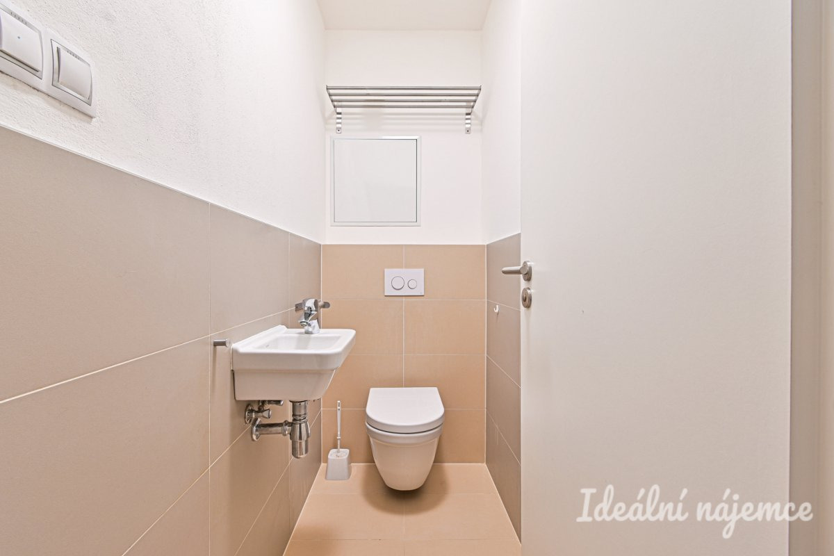 Koupelna je vybavena vanou a pračkou, toaleta je umístěna samostatně. Byt je ve velmi dobrém stavu a je vhodný pro jednotlivce nebo pár, kteří hledají moderní bydlení v klidném prostředí s dobrou dostupností do centra města.