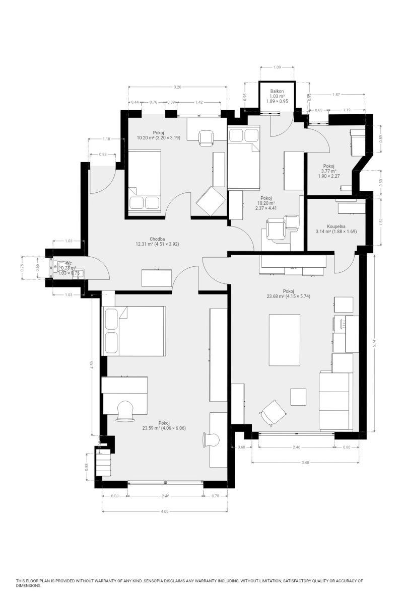 Byt se nabízí částečně vybavený dle fotografií (součástí nebudou postele). Dominantou je světlý obývací prostor s kuchyňským koutem, který disponuje varnou deskou, myčkou, troubou, lednicí, jídelním stolem a židlemi. Jednotlivé pokoje jsou neprůchozí a díky svému uspořádání poskytují dostatek soukromí pro rodinu i spolubydlení. Koupelna je vybavena sprchovým koutem a umyvadlem. Toaleta je odděleně.