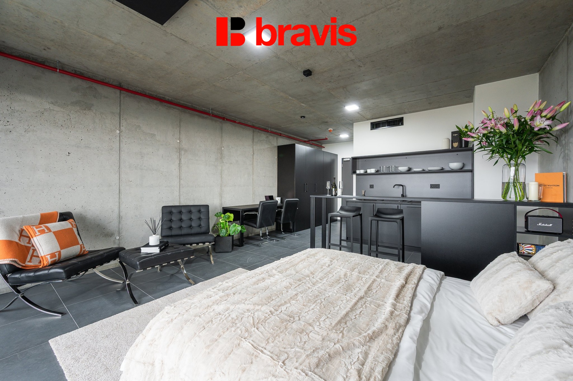 Ikonické křeslo Barcelona, komfortní postel (160×200 cm) s kvalitní matrací, pracovní zóna, velkorysé úložné prostory a stylový barový pult pro vaše ráno i večer.