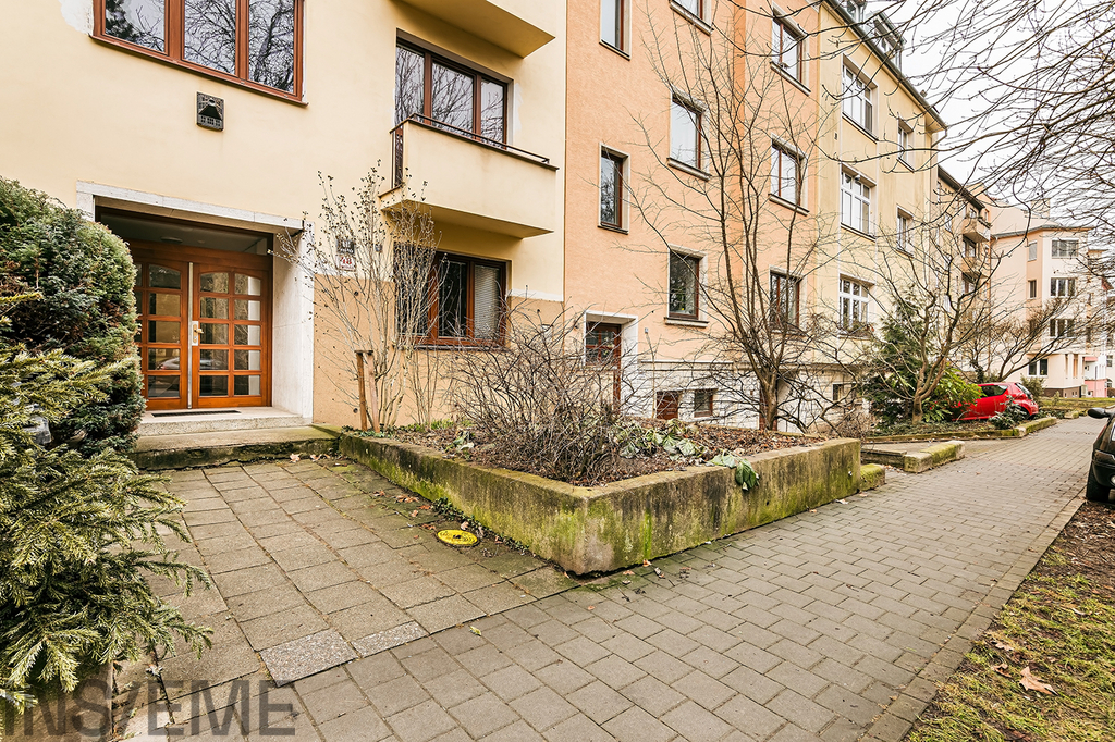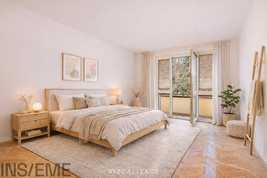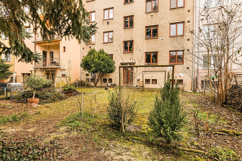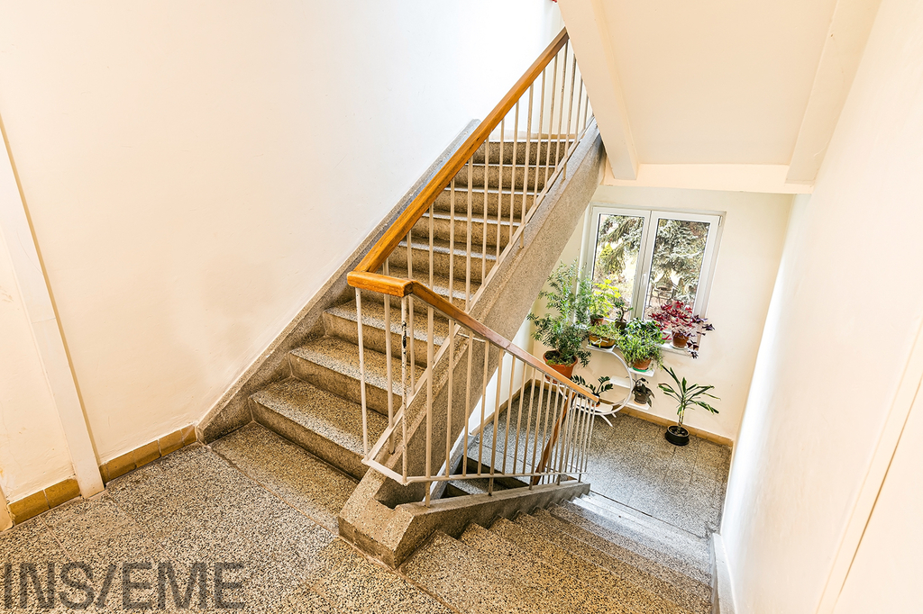 Dispozice bytu je velmi praktická – nabízí vstupní halu, tři samostatné pokoje, kuchyni, komoru, koupelnu a WC. Příjemným bonusem je balkon orientovaný do zeleně a dva sklepy, které poskytují nadstandardní úložný prostor. K dispozici je také malá zahrádka ve vnitrobloku.