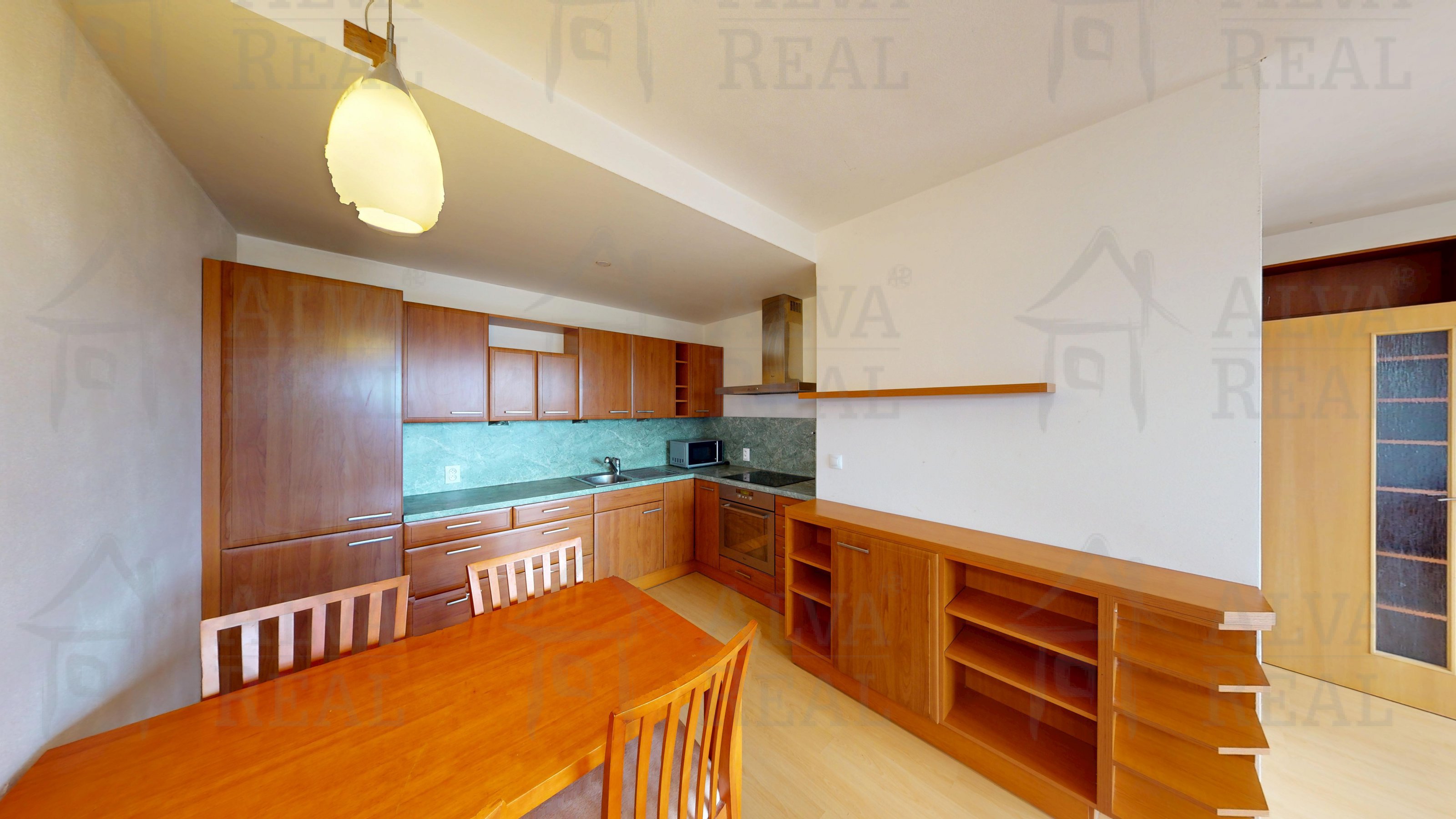 Vybavení bytu: kuchyňská linka vč. spotřebičů (el. trouba s varnou deskou, digestoř, vestavěná lednice, mikrovlnná trouba), v obývacím pokoji vestavěná knihovna, rohová pohovka a křesla, v ložnici manželská postel a šatní skříň, v koupelně pračka.