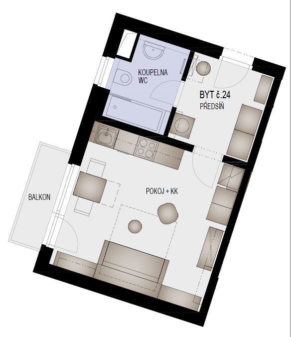 Dispozice: 1+kk, 32 m2 + balkon 2,5 m2 + sklep 2,3 m2