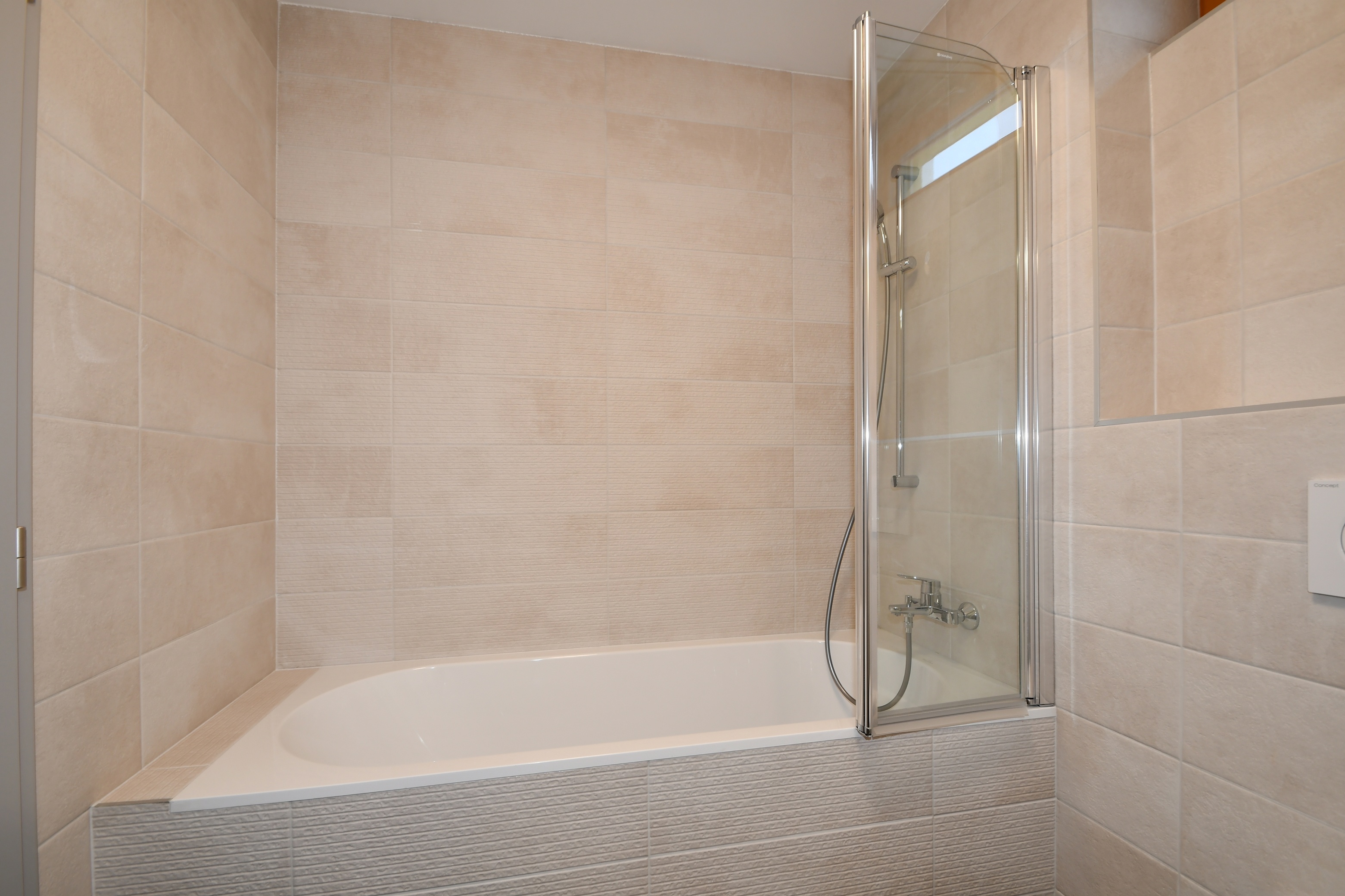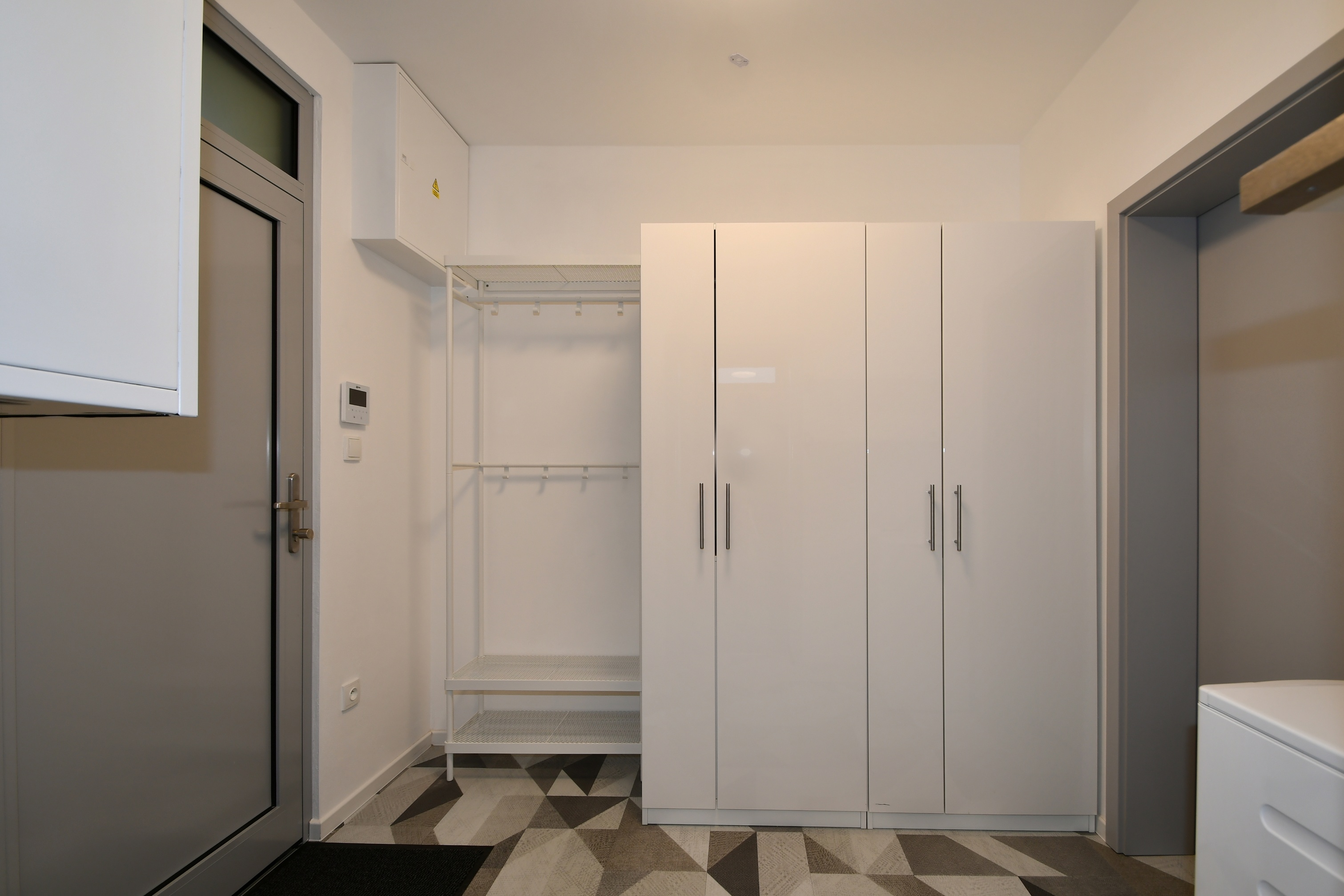 Koupelna (4,7 m2) je vybavena vanou, umyvadlem a WC. V předsíni (6,2 m2) je umístěn dveřní videotelefon a přípojka na pračku.