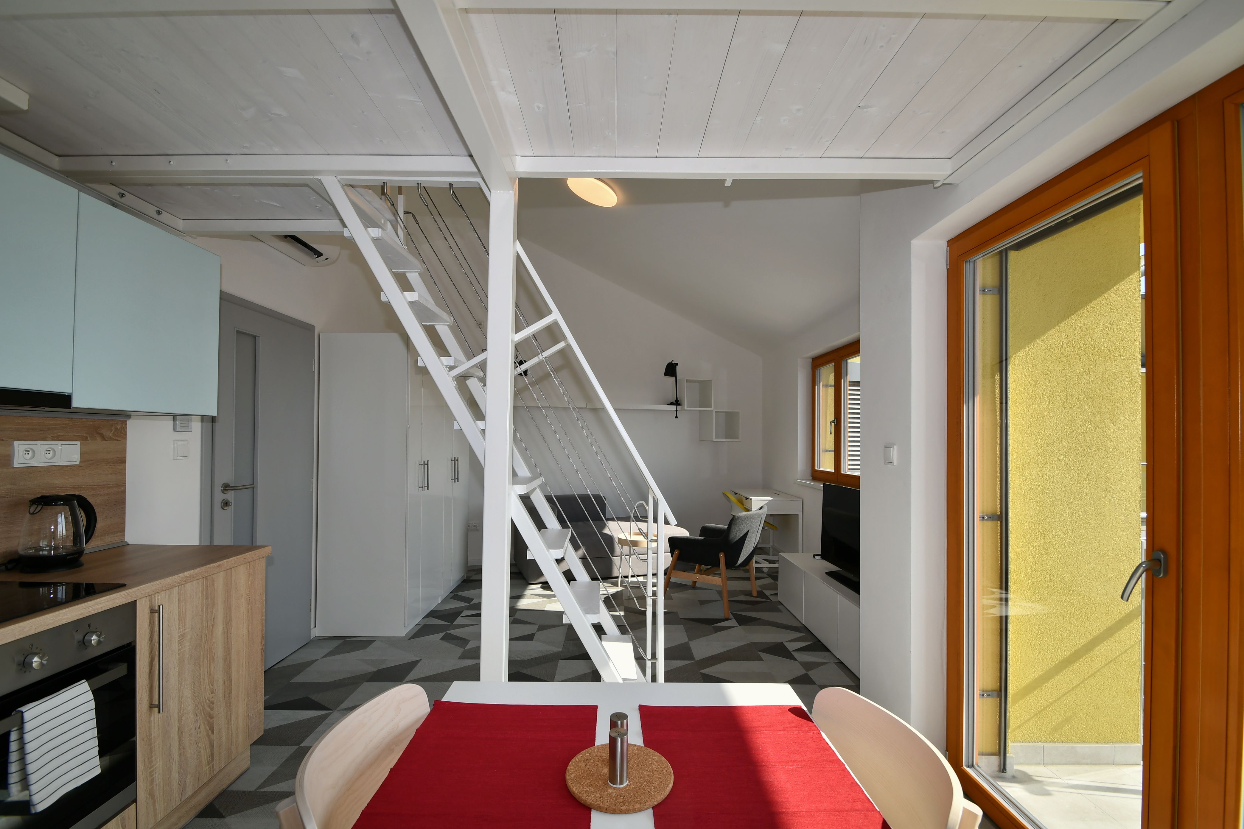 Vybavení: kuchyňská linka se spotřebiči, AC Daikin, podlahové topení Baxi, Smart Home Siemens, žaluzie VEKRA, vinylové podlahy Expona, dlažba RAKO, obklady ARGENTA