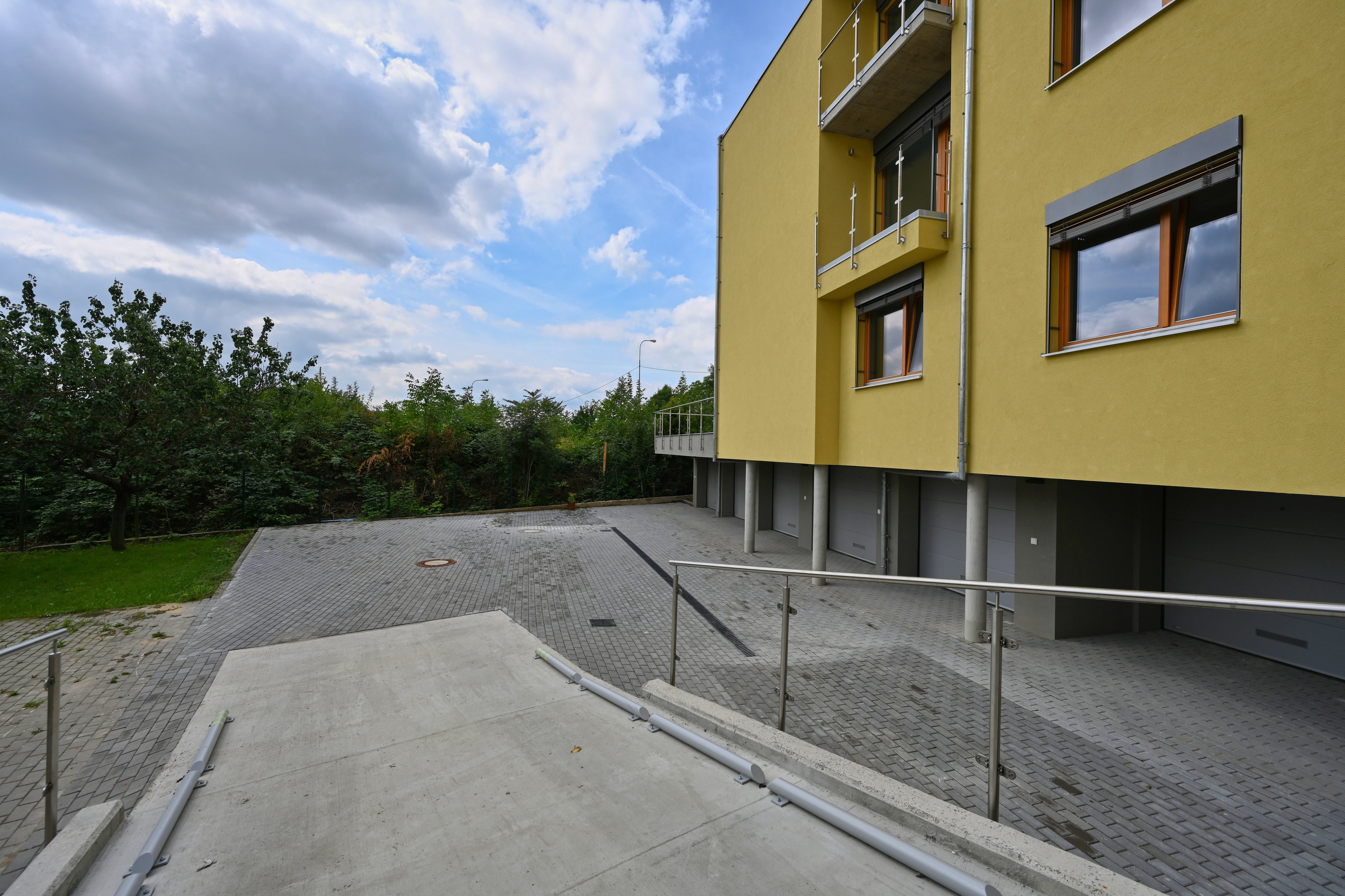 K bytu náleží sklepní kóje 2,4 m2 umístěná v suterénu domu. Součástí nabídky je možnost koupě vlastní garáže s dálkově ovládanými sekčními vraty a vjezdem z dvorní části objektu. K dispozici jsou garáže o ploše od 19,5 m2, s cenou od 1 367 000 Kč.