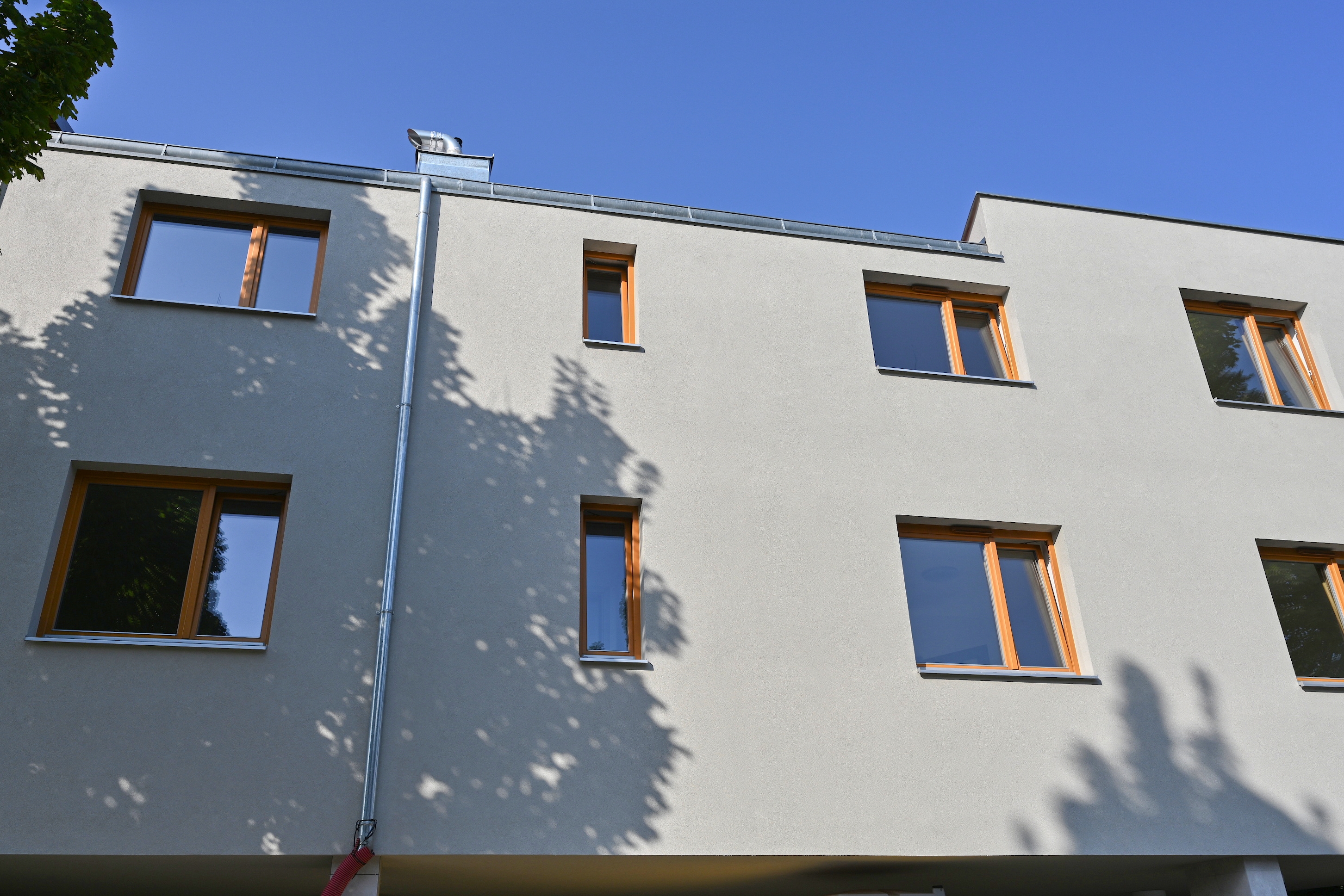 Dřevěná okna s trojskly doplňují elektricky ovládané žaluzie VEKRA pro zajištění soukromí a akustického komfortu. V celém bytě jsou vinylové podlahy.