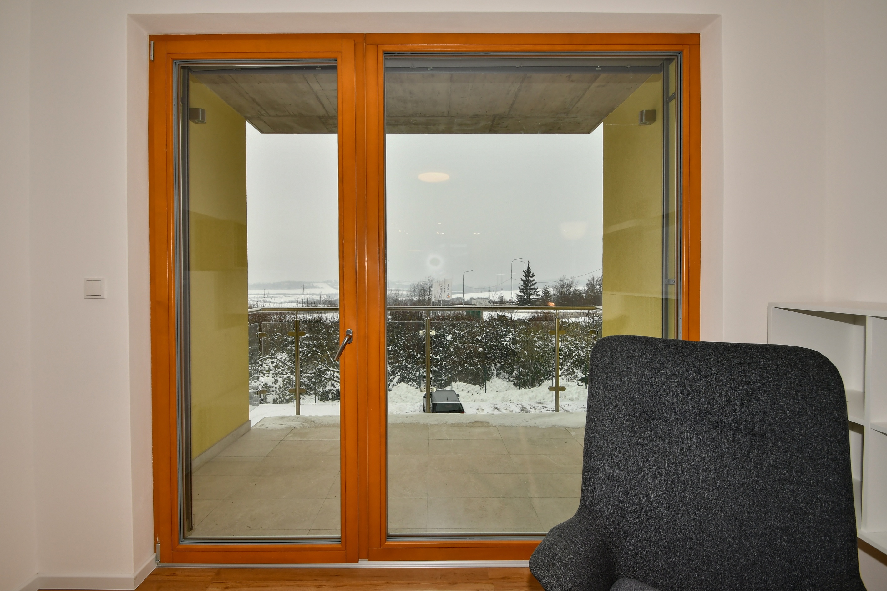 Dřevěná okna s trojskly doplňují elektricky ovládané předokenní žaluzie VEKRA v obývacím pokoji, které zajišťují ticho a soukromí. V celém bytě jsou vinylové podlahy.