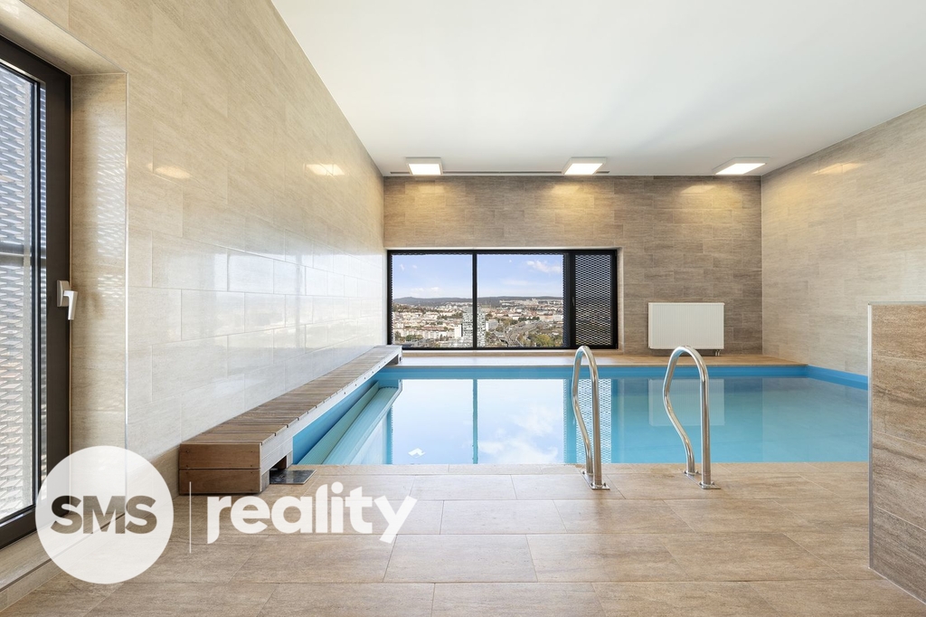 Tento exkluzivní 2-podlažní apartmán s wellness zónou nabízí prestižní bydlení. Kromě dechberoucího výhledu na celé Brno se mohou noví nájemníci těšit na vyhřívaný bazén o rozměrech 8 x 4 metrů, saunu a částečně zastřešenou terasu o ploše 51 metrů čtverečních.