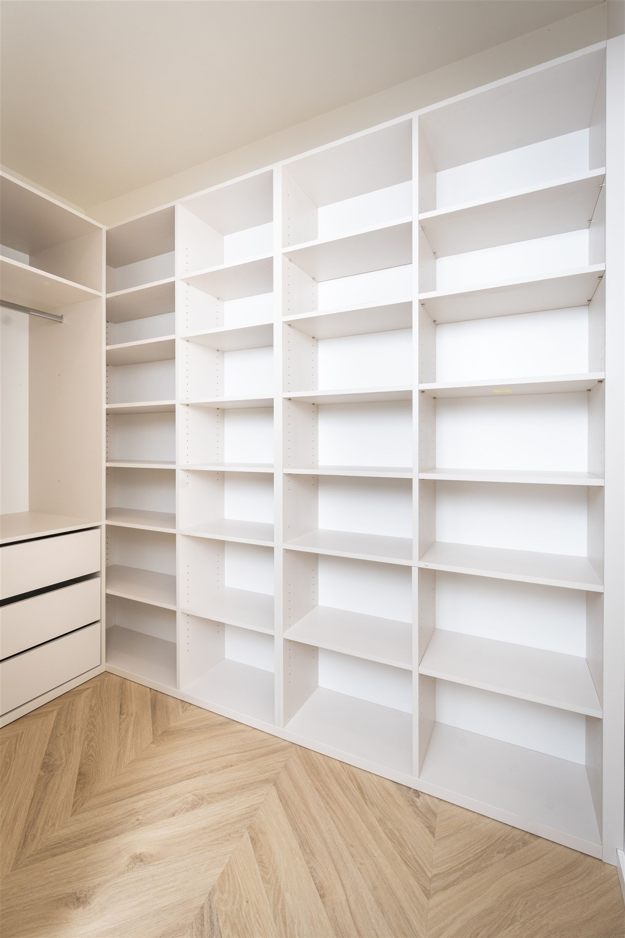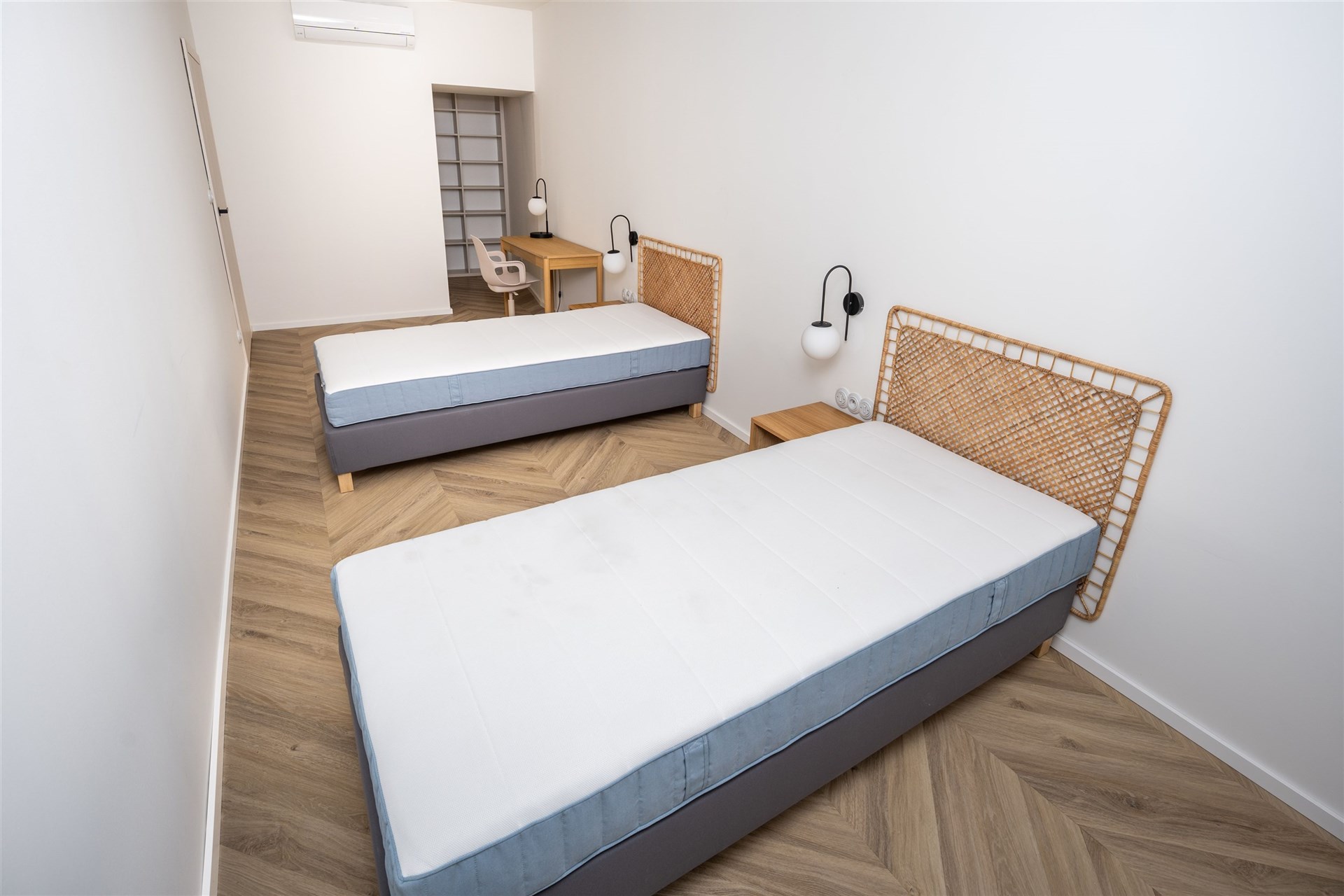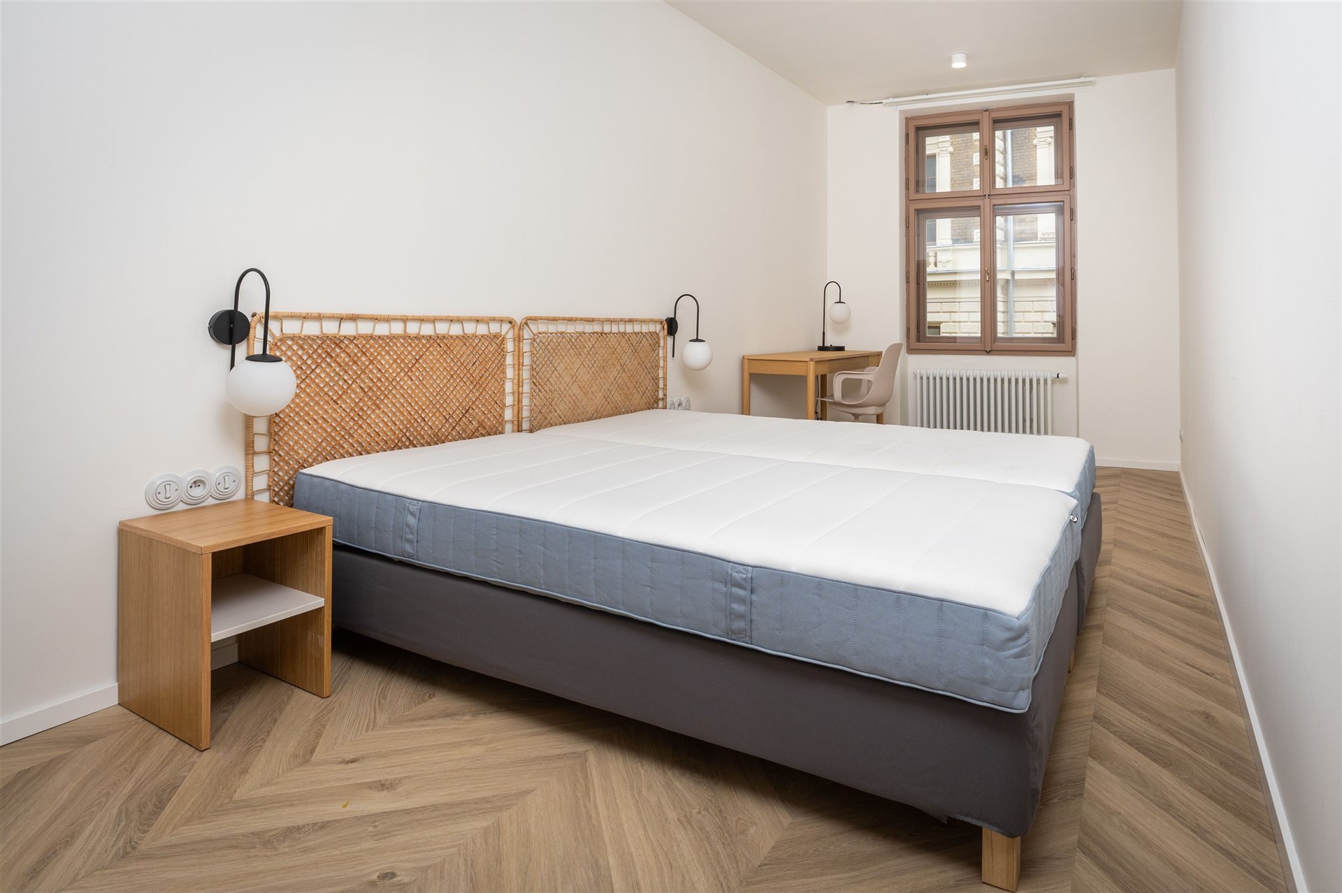 Ložnice nabízí klidné a elegantní zázemí s manželskou postelí, nočními stolky s decentním osvětlením a velkorysou šatnou. Součástí ložnice je i pracovní kout, který lze využít jako toaletní stolek.