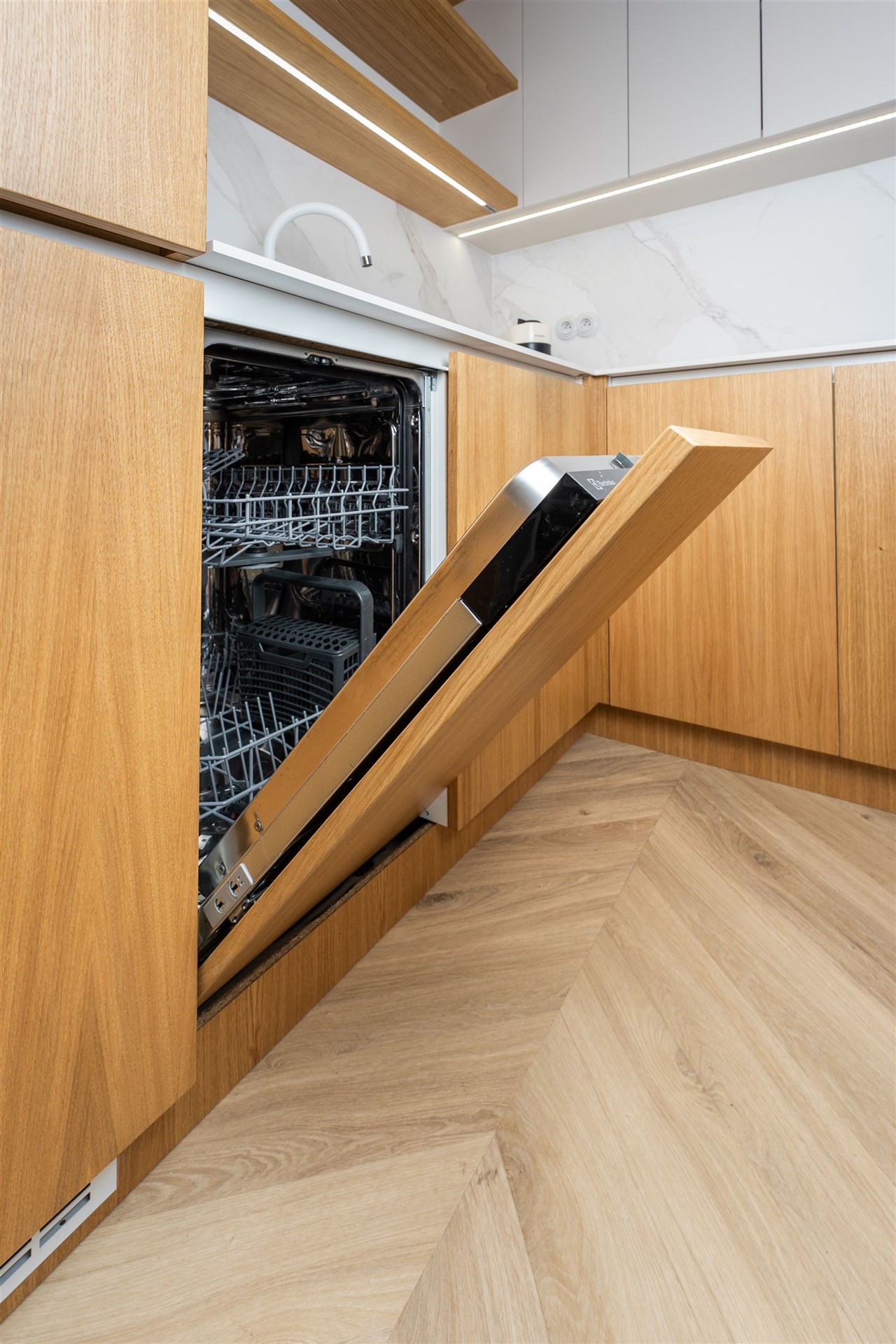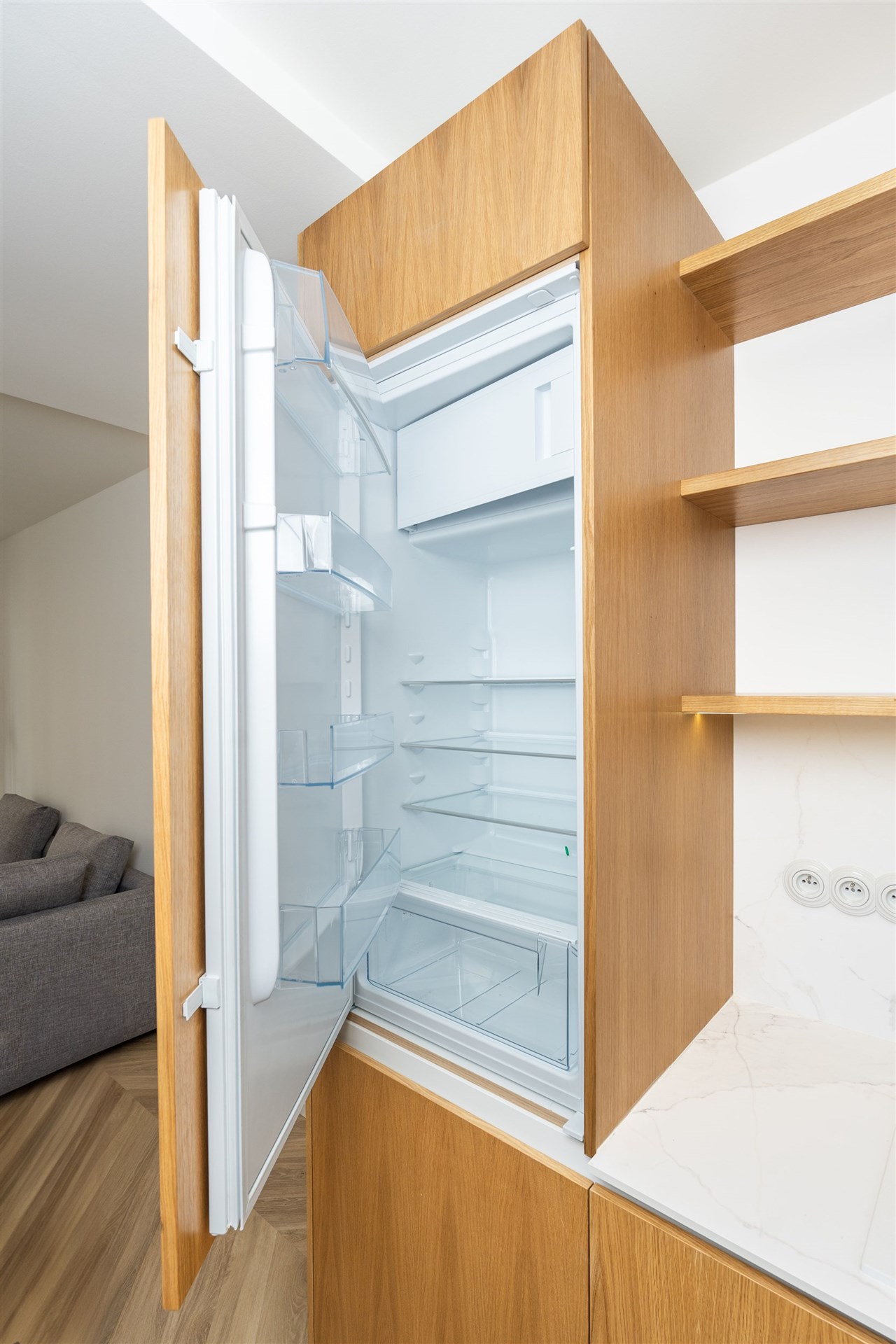 Apartmán je navržen tak, aby poskytoval maximální pohodlí i při delším pobytu. Dominantou prostoru je prostorný obývací pokoj s pohodlným gaučem a televizí, který je propojen s moderním kuchyňským koutem. Ten je plně vybaven kvalitními spotřebiči – varnou deskou, digestoří, kombinovanou elektrickou a mikrovlnnou troubou, varnou konvicí a lednicí s mrazákem.