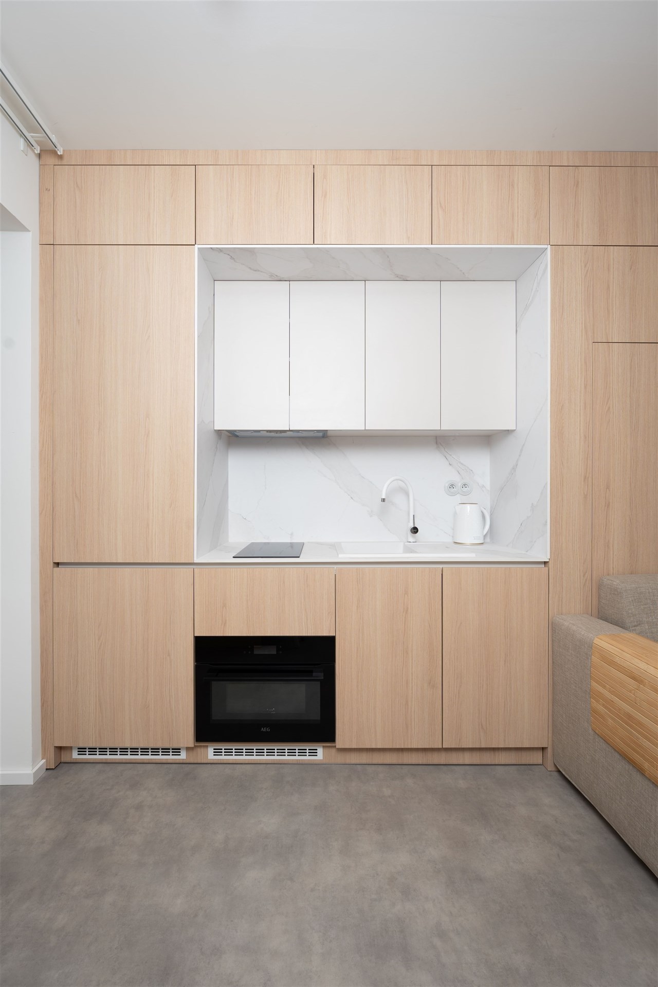 Apartmán je plně vybaven tak, aby ubytovaným poskytl maximální komfort během jejich pobytu. Kuchyňský kout je kompletně zařízen moderními spotřebiči, včetně varné desky, digestoře, kombinované elektrické a mikrovlnné trouby, rychlovarné konvice a lednice s mrazákem. Dominantou obývací části je designový rozkládací gauč, který lze snadno přeměnit v pohodlné dvoulůžko. K dispozici je také moderní televize s možností sledování všech oblíbených programů a vestavěné skříně z kvalitních materiálů, které zajišťují dostatek úložného prostoru. Elegantní koupelna je vybavena sprchovým koutem, toaletou a praktickým úložným prostorem. Součástí apartmánu je také pračka, nenápadně integrovaná do interiéru, klimatizace zajišťující příjemné klima v každém ročním období a vysokorychlostní internetové připojení.