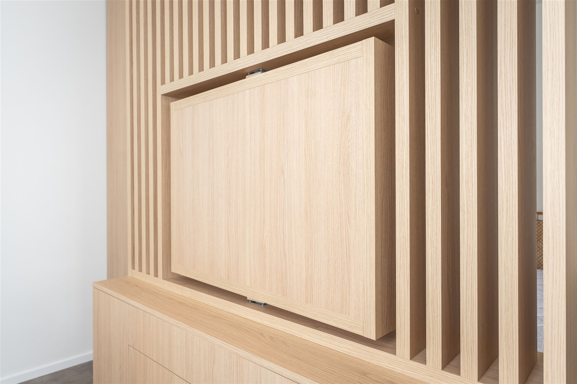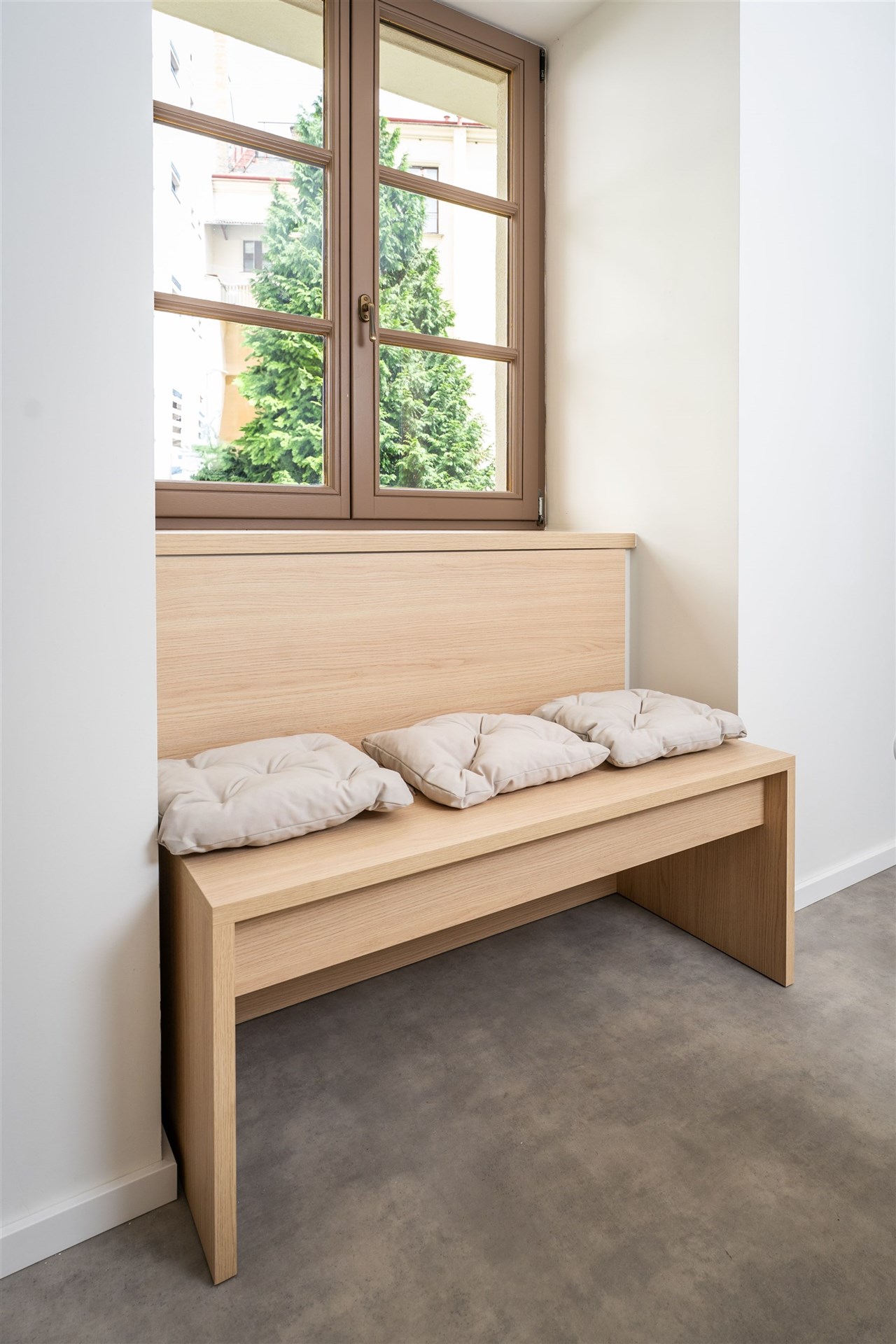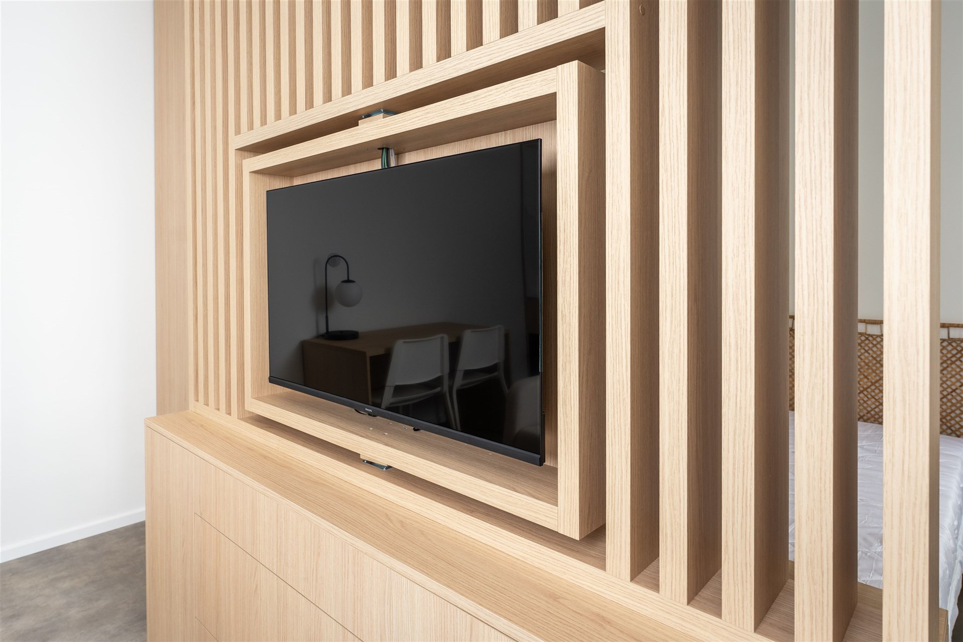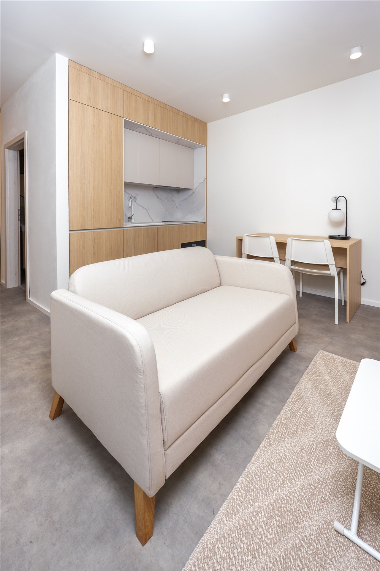 Vestavěné skříně z prvotřídních materiálů poskytují dostatek úložného prostoru. Koupelna nabízí elegantní sprchový kout, toaletu a umyvadlo se zrcadlem a úložným prostorem. Součástí vybavení je také pračka se sušičkou, která je chytře skrytá, aby nenarušovala čistý vzhled interiéru. Samozřejmostí je vysokorychlostní internetové připojení a klimatizace pro Váš maximální komfort.