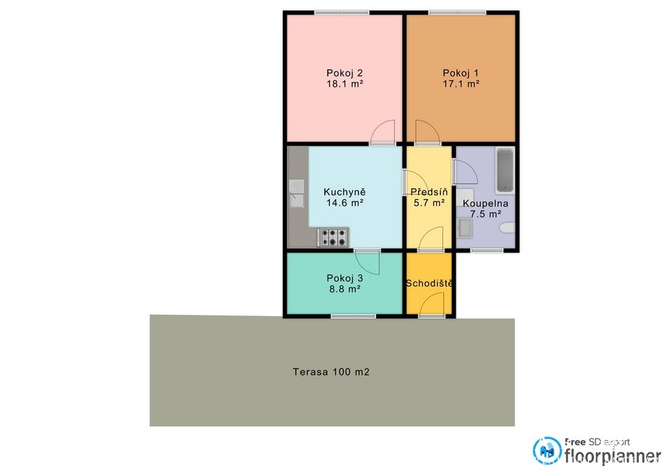 Bonus: Z bytu je přístup na úžasnou zastřešenou terasu o rozloze 100 m2 – ideální na studium venku nebo ranní kávu.