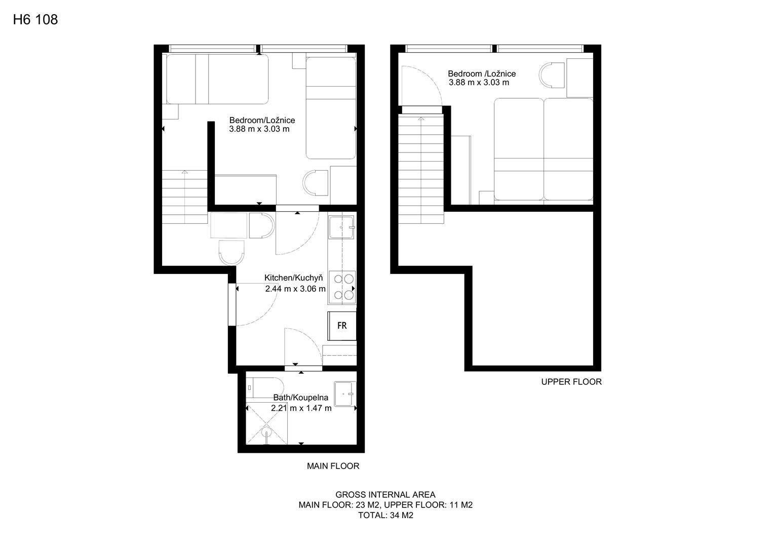 Jedná se o podnájem kompletně vybavené bytové jednotky o velikosti 2+1. Při vstupu do bytové jednotky se nachází moderní kuchyně včetně lednice, sporáku s troubou, mikrovlnné trouby, rychlovarné konvice, digestoře a dřezu. Zároveň v kuchyni naleznete jídelní stůl se židlemi. Jednotce imponuje důmyslné řešení dvou neprůchozích pokojů, které jsou umístěny nad sebou a zajistí tak plné využití prostoru. V každém pokoji naleznete dvě prostorné postele s pohodlnou matrací. U postele dále naleznete noční stolek s lampičkou. V jednotce se dále nachází pracovní stoly se židlemi a prostorná skříň. Koupelna nabízí sprchový kout, záchod a umyvadlo se zrcadlem. K dispozici je příprava pro připojení vlastní pračky.