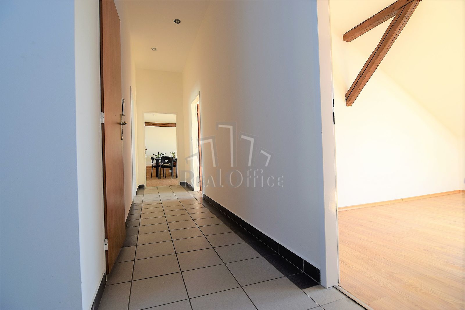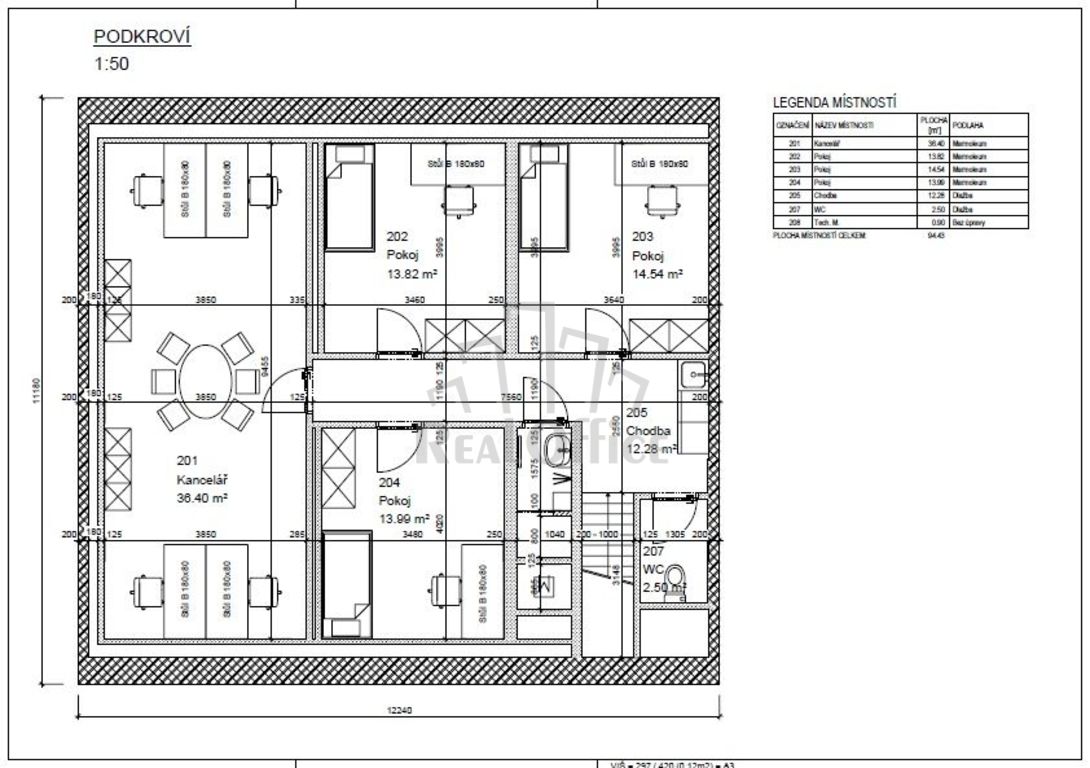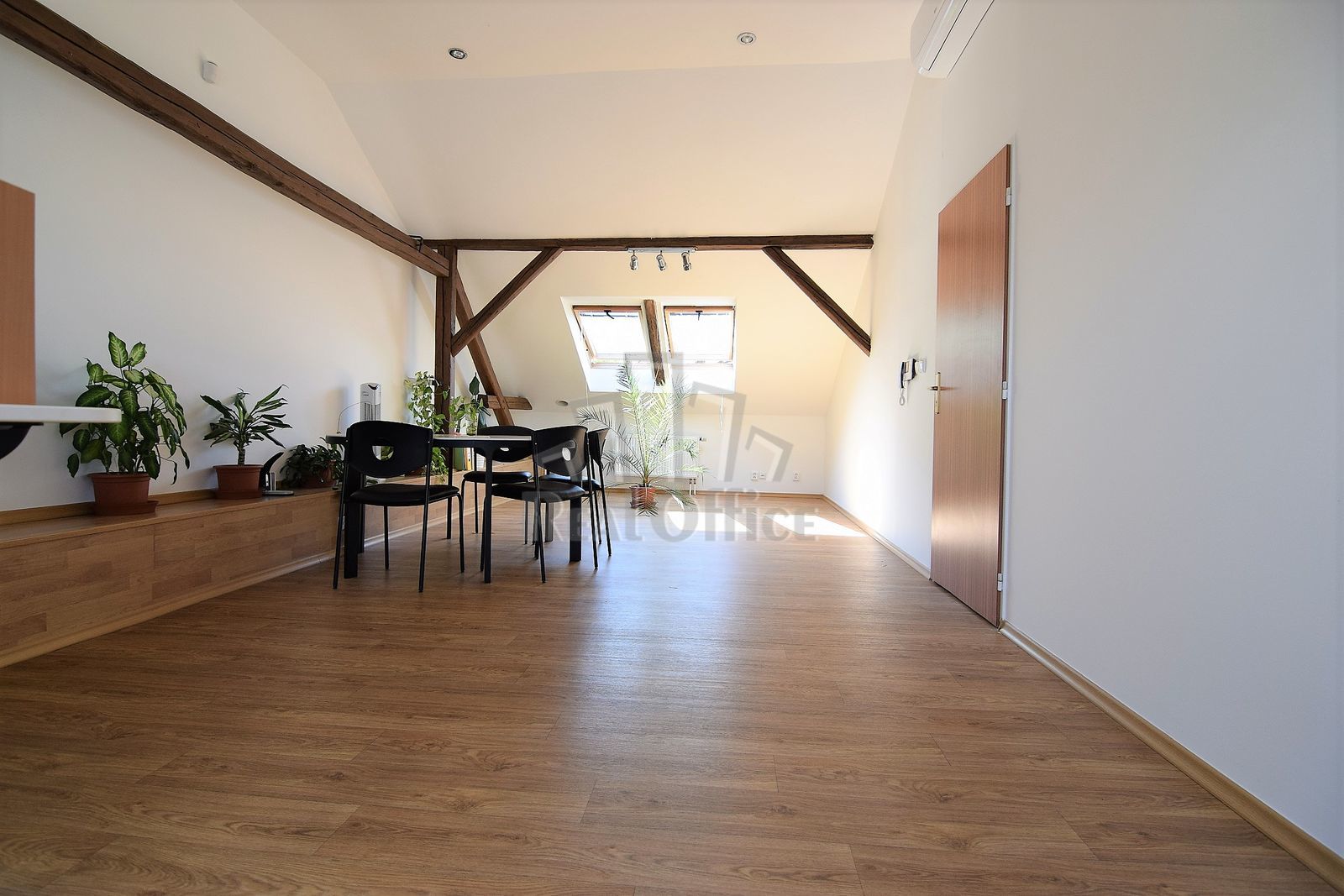 Reprezentativní prostory se nachází ve 2. patře/2. (podkroví) cihlového zrekonstruovaného domu, který je celý využíván ke komerčním účelům. Společné prostory - chodba 12 m2, soc. zařízení 5 m2 (místnost s umyvadlem+sprchovým koutem a místnost s umyvadlem+WC). Prostory jsou orientovány do ulice i do dvora (v půdorysu č.201, 202, 203 a 204 - v této místnosti nyní také umyvadlo). V prostoru chodby je k dispozici kuchyňka s lednicí. Internet v ceně, wi-fi. Možnost parkování před domem. Dům střežen kamerovým systémem, otevírání vstupních dveří s kamerou. Prostory lze užívat pro klasickou kancelářskou/obchodní činnost, popř. i pro masáže, fyzioterapii a obdobné činnosti.