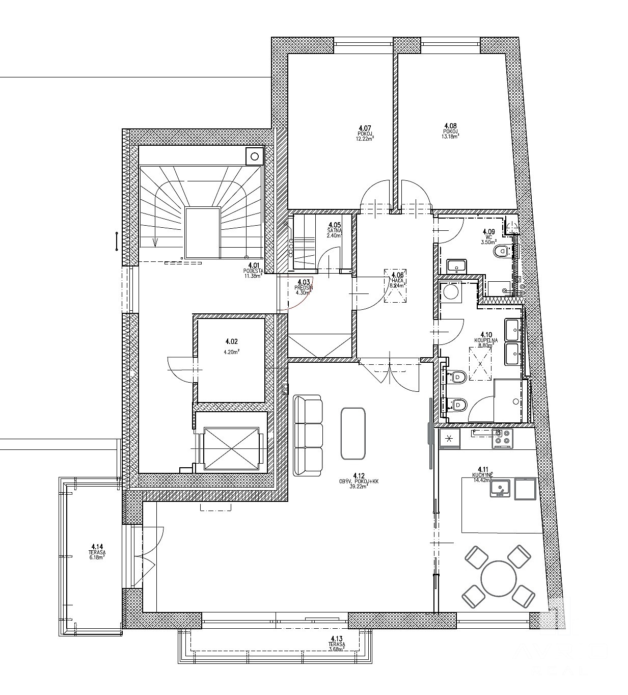Celková plocha bytu je 106,28 m2, k němu náleží dvě terasy 3,68 m2 a 6,8 m2. Dispozice bytu: kuchyně (oddělena posuvnými dveřmi) 14,42 m2, obývací prostor 39,22 m2, ložnice 12,22 m2, druhá ložnice 13,18 m2, hala 8,24 m2, předsíň 4,30 m2, šatna 2,40 m2, koupelna s WC 8,80 m2, druhé samostatné WC 3,50 m2. Byt se pronajímá jako částečně zařízený - tzn. kuchyňská linka včetně vestavěných spotřebičů tak, jak ji vidíte ve fotogalerii.