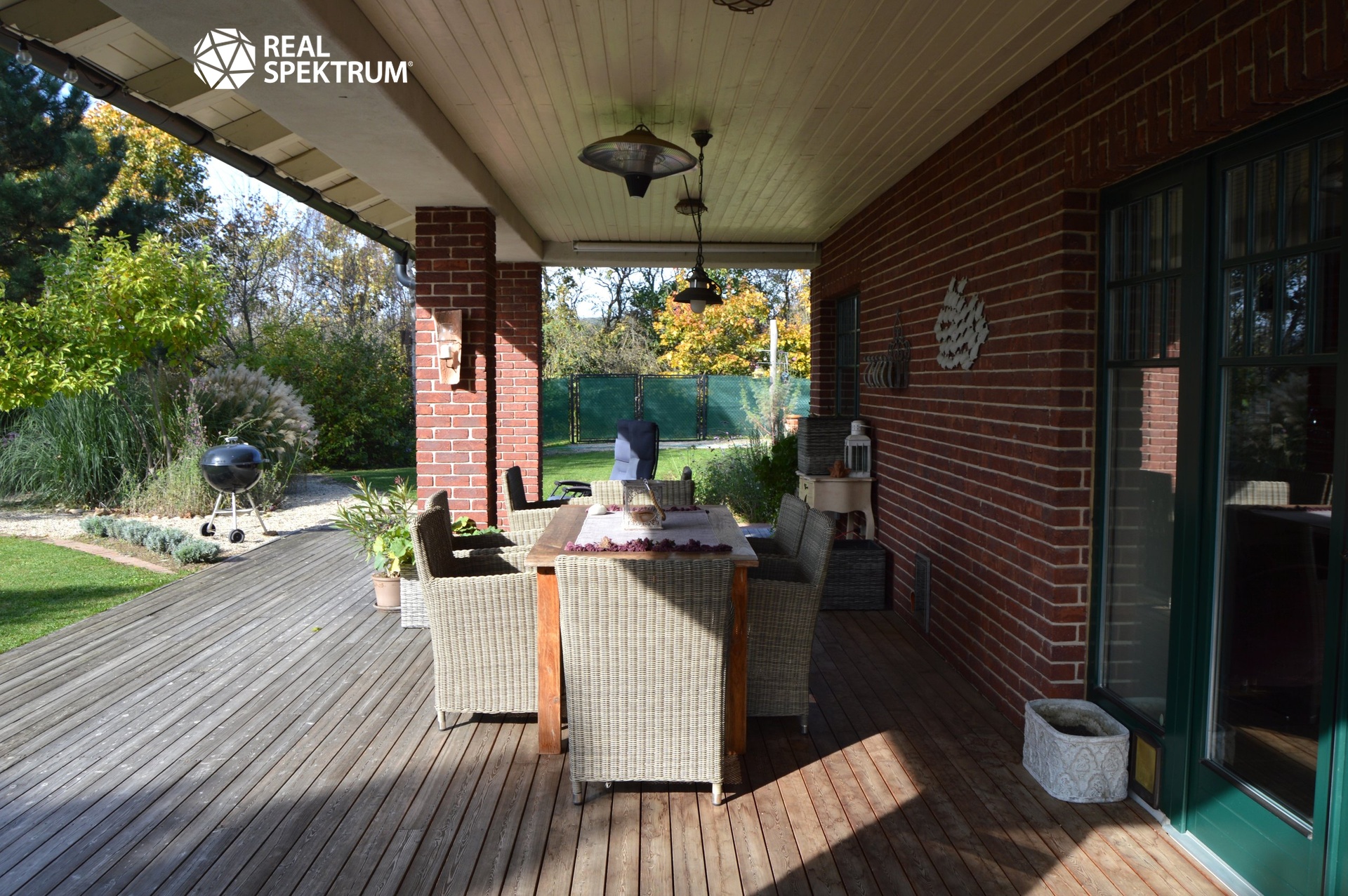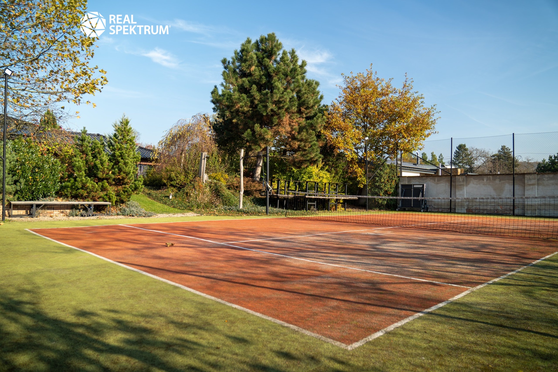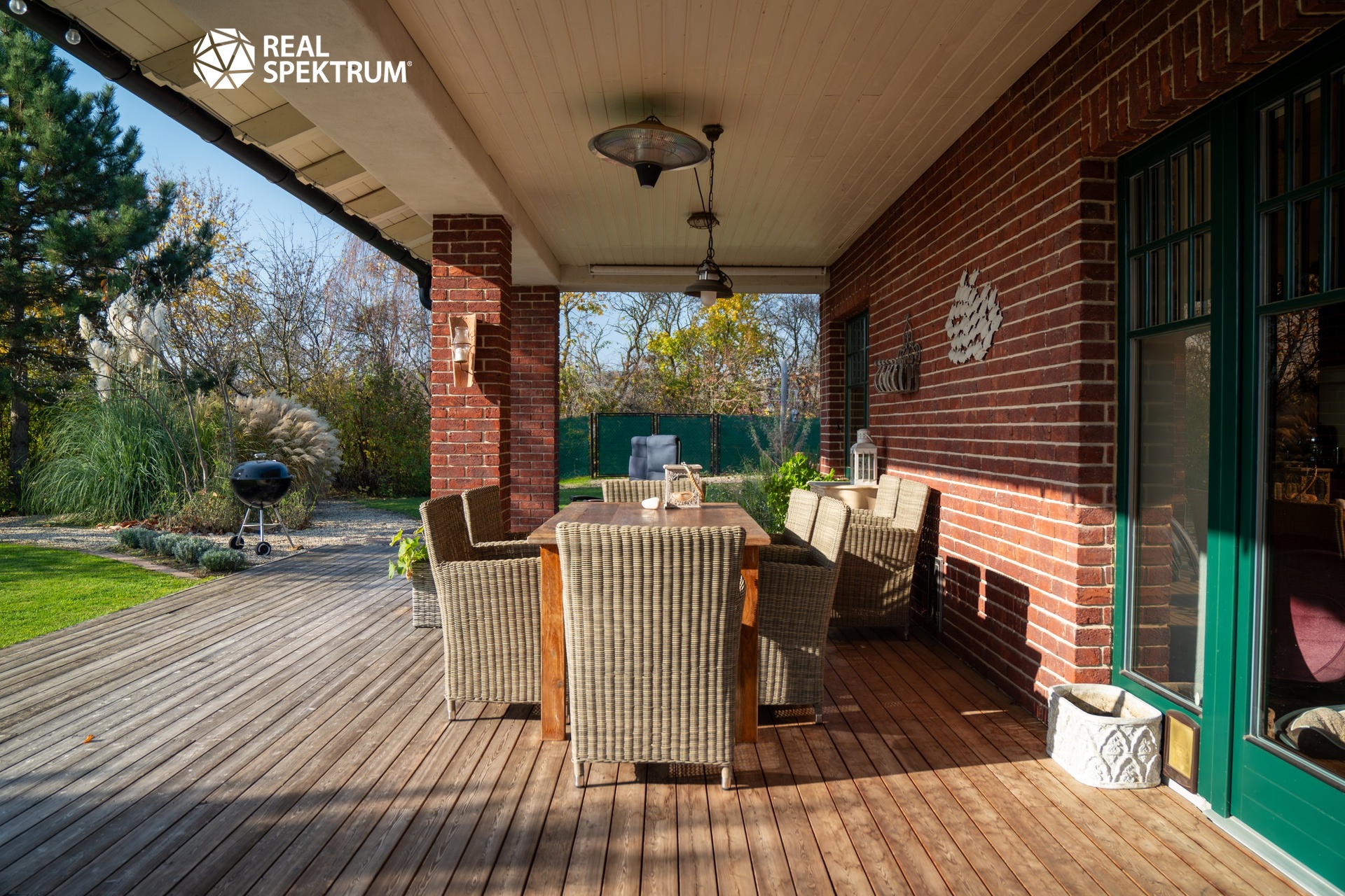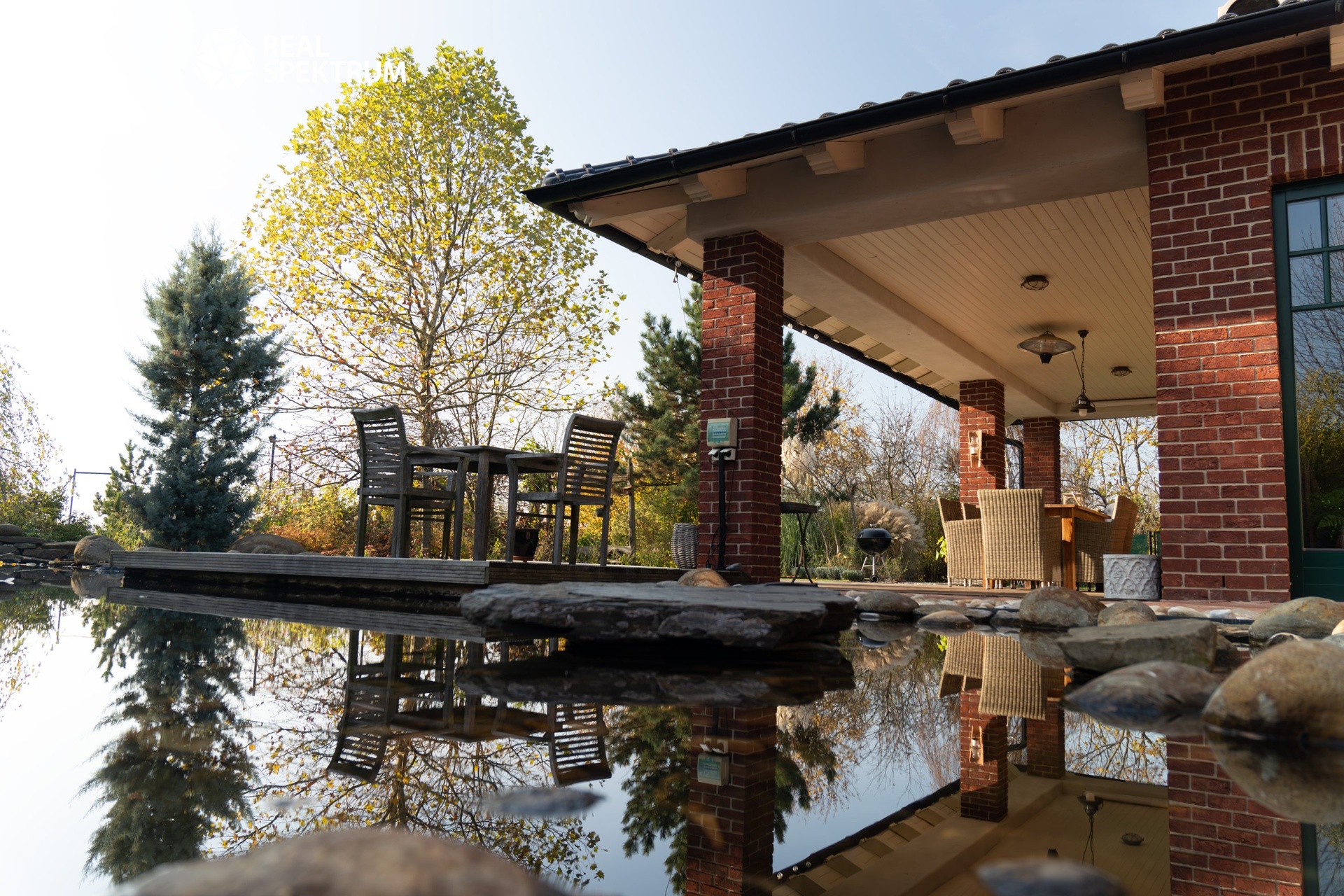 Exteriér domu nabízí ke zpestření života koupací jezírko (25 m3) s dřevěným molem s adekvátní technologií zajišťující čistou vodu po celý rok, dále venkovní ohniště, vinný sklípek či sportovní hřiště s umělým povrchem. Dům disponuje velkou útulnou zastřešenou terasou (zastřešená část 31,2 m²; s nezastřešenou částí celkem 50 m²).