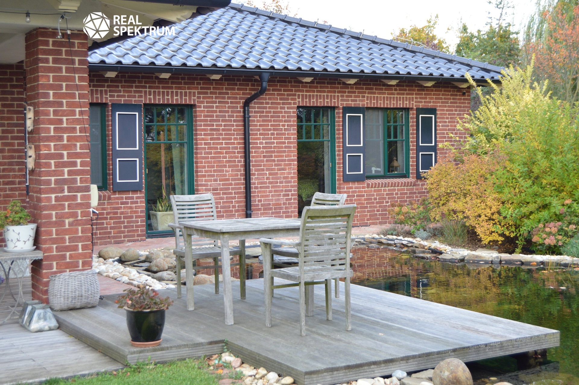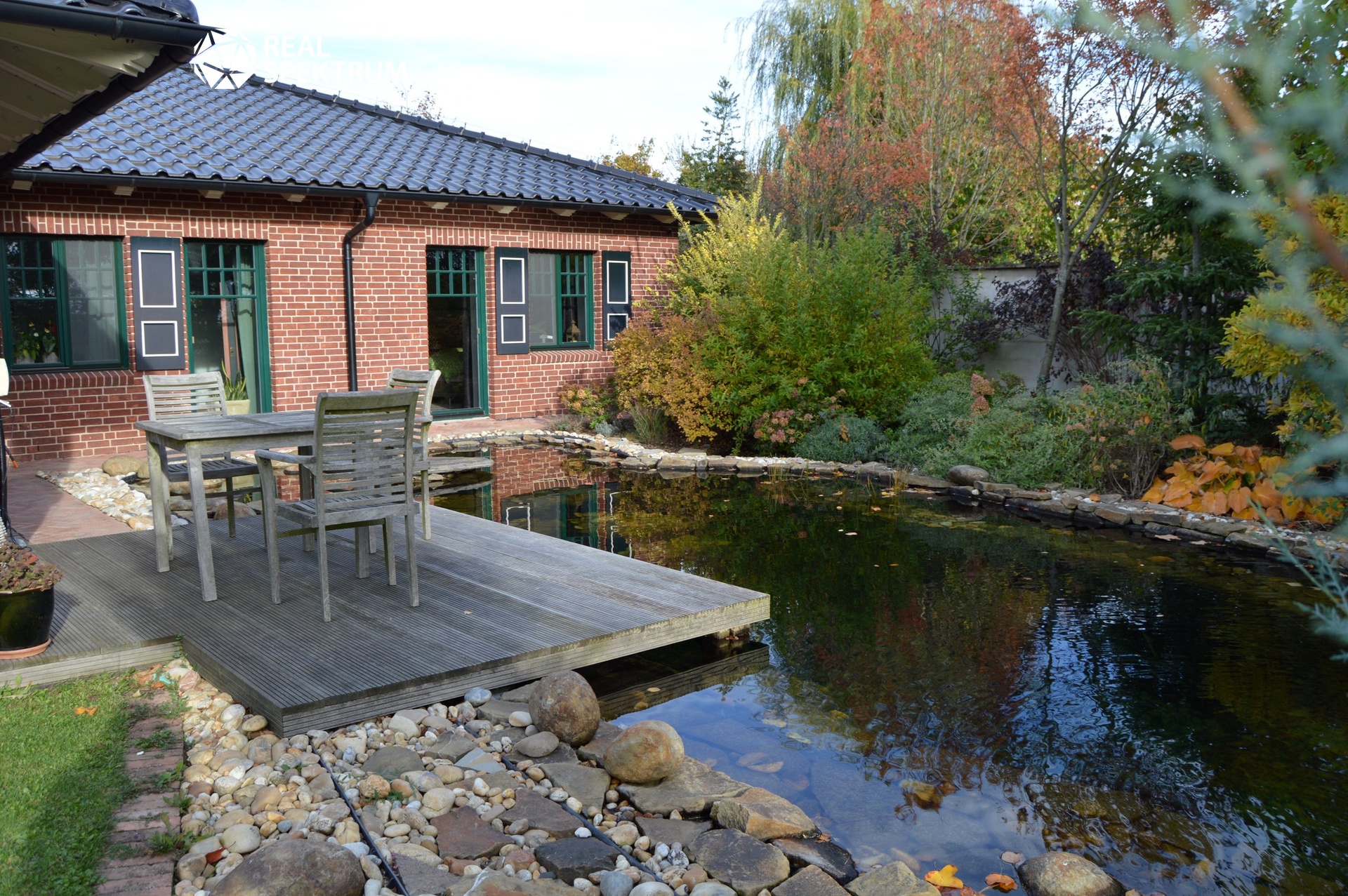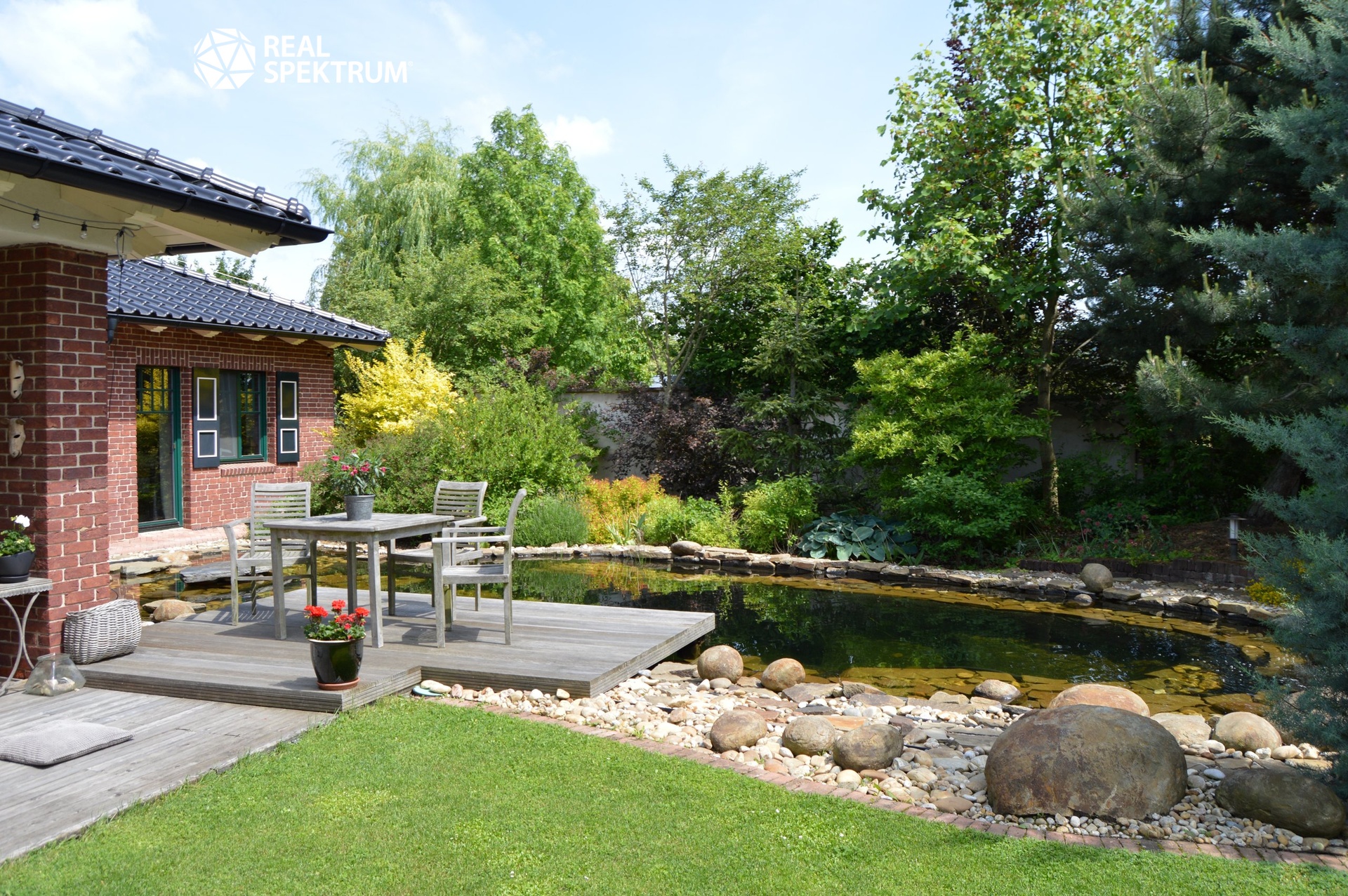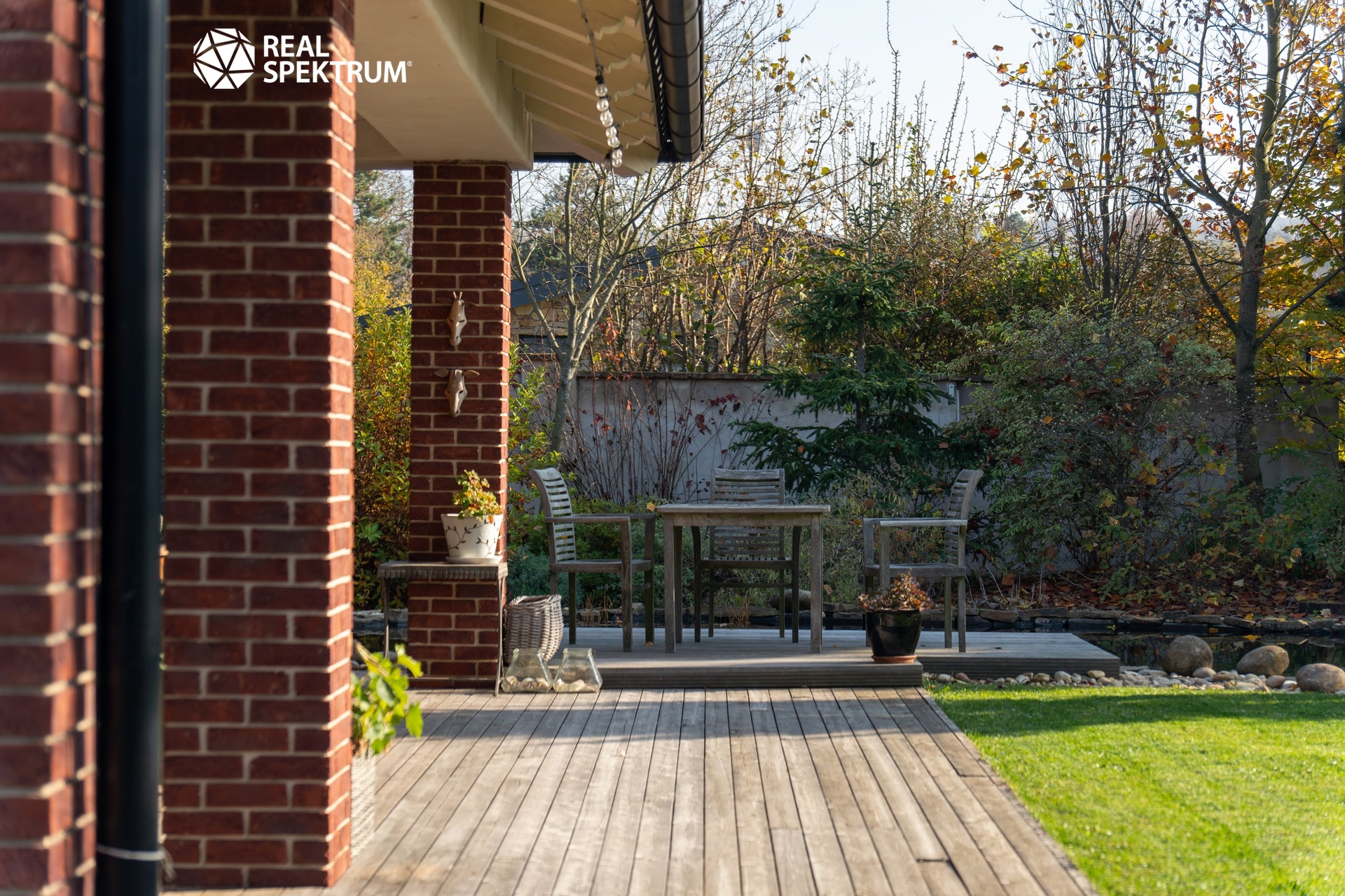 Exteriér domu nabízí ke zpestření života koupací jezírko (25 m3) s dřevěným molem s adekvátní technologií zajišťující čistou vodu po celý rok, dále venkovní ohniště, vinný sklípek či sportovní hřiště s umělým povrchem. Dům disponuje velkou útulnou zastřešenou terasou (zastřešená část 31,2 m²; s nezastřešenou částí celkem 50 m²).