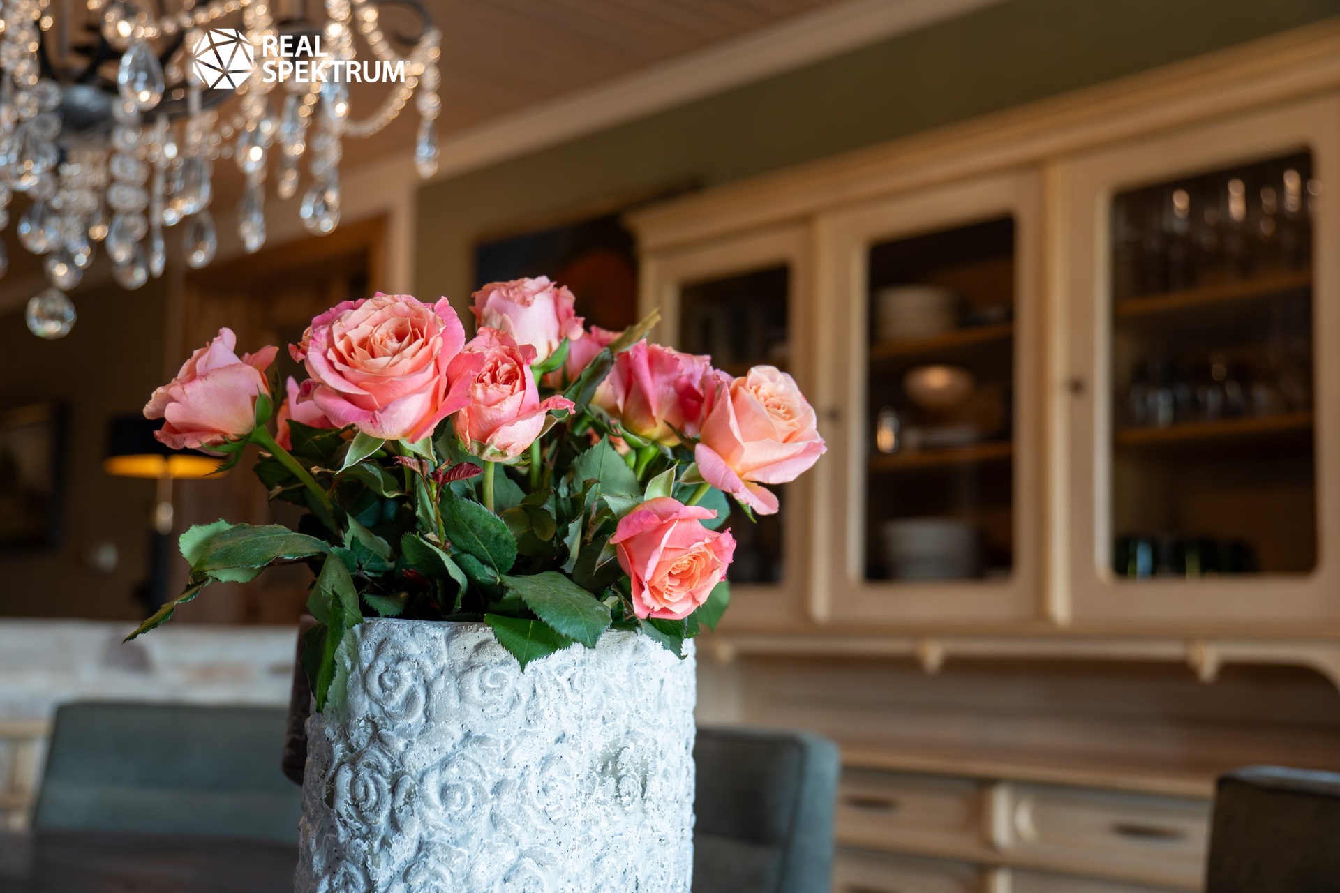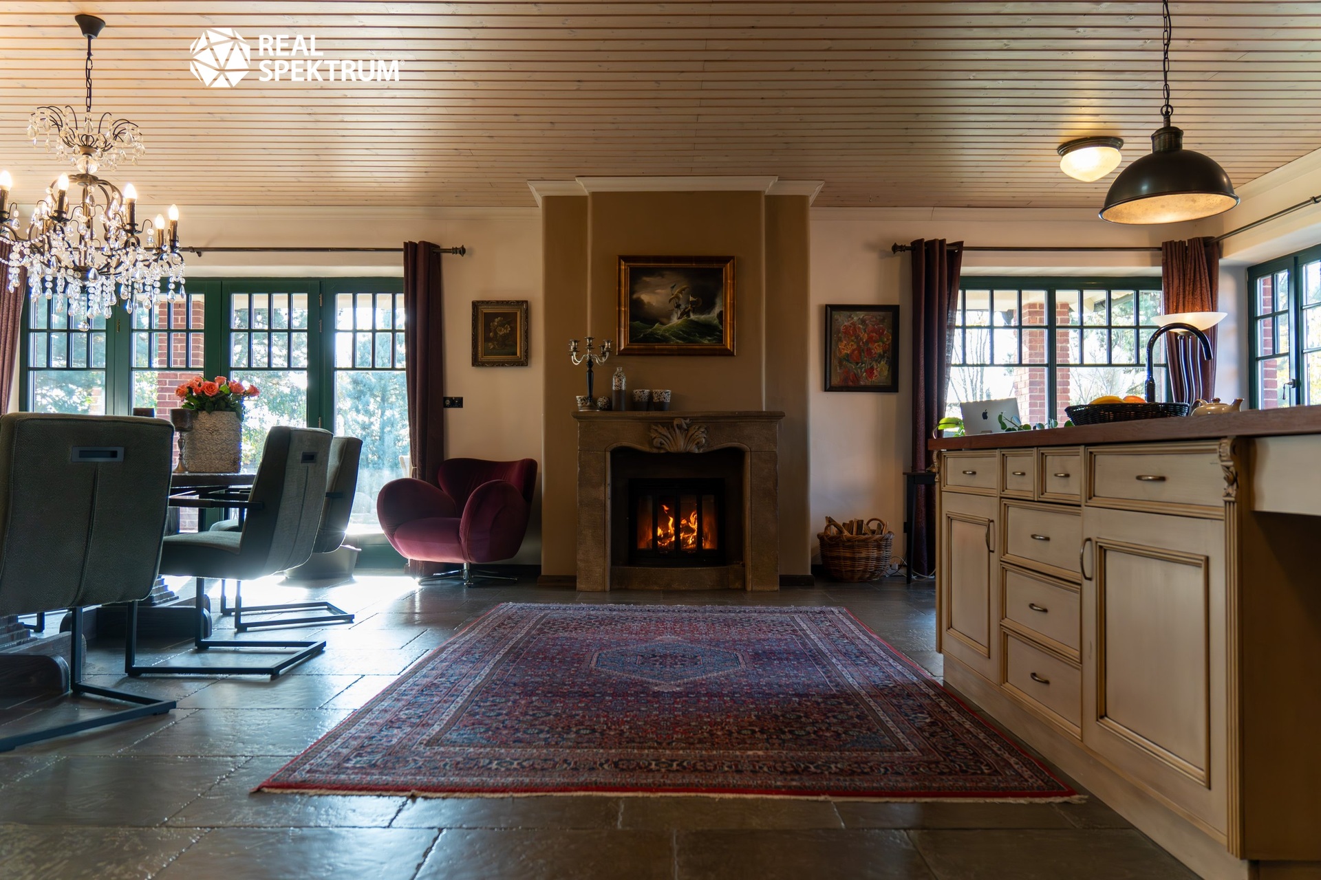 Interiér je laděn do tmavších tónů v kombinaci industriálního a rustikálního stylu, což jej tvoří jednak moderním a jednak útulným místem k životu. Stran designu interiéru jsou stropy v celém domě jsou řešeny bezúdržbovými dřevěnými lamelami (palubkami) ve světlém odstínu lazury. Rodinný dům je vybaven dvěma toaletami, jedním bidetem a dvěma koupelnami. V domě je i připravený prostor na vnitřní saunu včetně dostatečné elektro kapacity pro ty, kteří by si chtěli život v této skvostné nemovitosti ještě více zpříjemnit. Hlavní obytné místnosti dominuje velký krb s krbovou vložkou, což dodává místu doslova teplo domova.