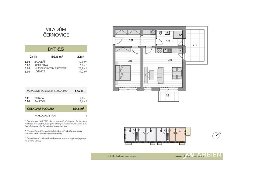 AMBIENTEN VIP Vám ve výhradním zastoupení majitele nabízí bytovou jednotku o dispozici 2+kk, která se nachází ve 2. nadzemním podlaží a její podlahová plocha činí 67,2 m². Díky terase o velikosti 9,81 m² a balkonu o velikosti 3,64 m² se celková plocha bytu rozšiřuje na 80,65 m².