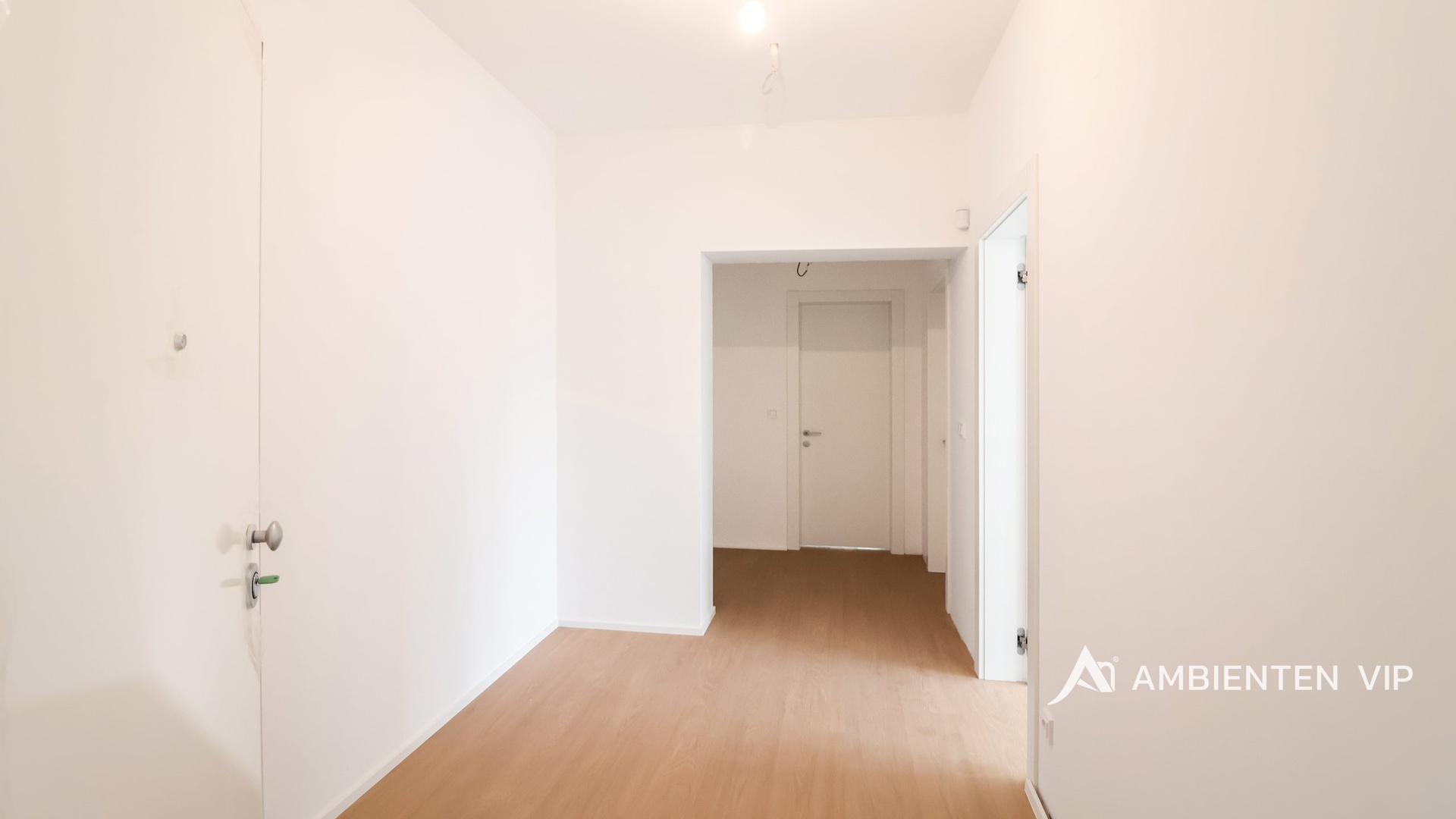 Dispozice bytu je navržena s důrazem na praktičnost i pohodlí moderního bydlení. Po vstupu Vás přivítá prostorná chodba o velikosti 10,93 m², kde je zároveň připravena instalace pro pračku a sušičku. Obývací pokoj s kuchyňským koutem o rozloze 26,78 m² je centrálním místem bytu a disponuje vstupem na balkon (3,64 m²) i na prostornou terasu (9,81 m²). Ložnice o velikosti 17,24 m² je situována do klidné části bytu a poskytuje dostatek prostoru pro odpočinek. Koupelna o rozloze 6,56 m² je vybavena moderním walk-in sprchovým koutem, závěsným WC a elegantní keramickou dlažbou. Ze samotné koupelny je rovněž přístup na terasu, což dodává prostoru vzdušnost a přirozené světlo.