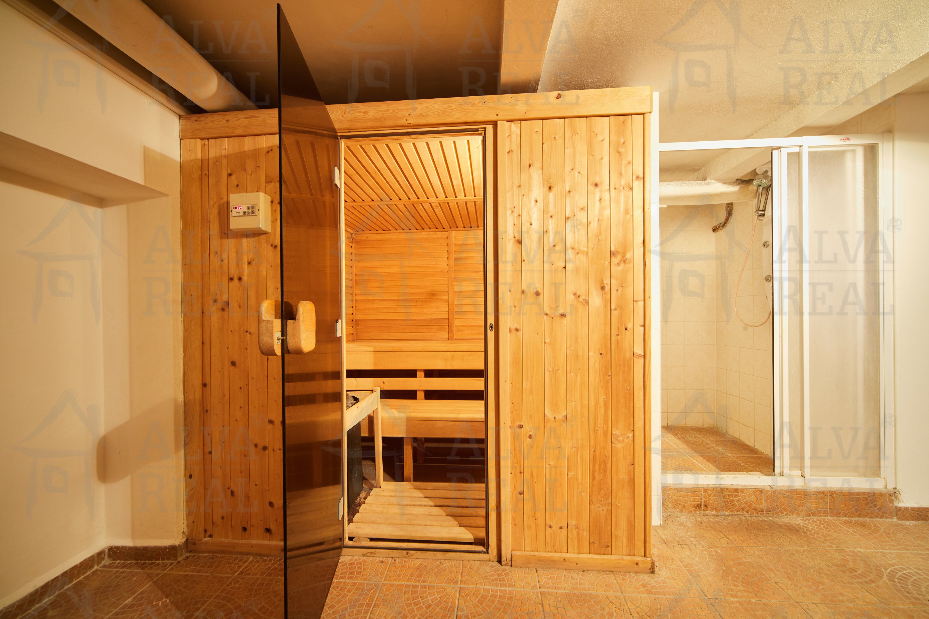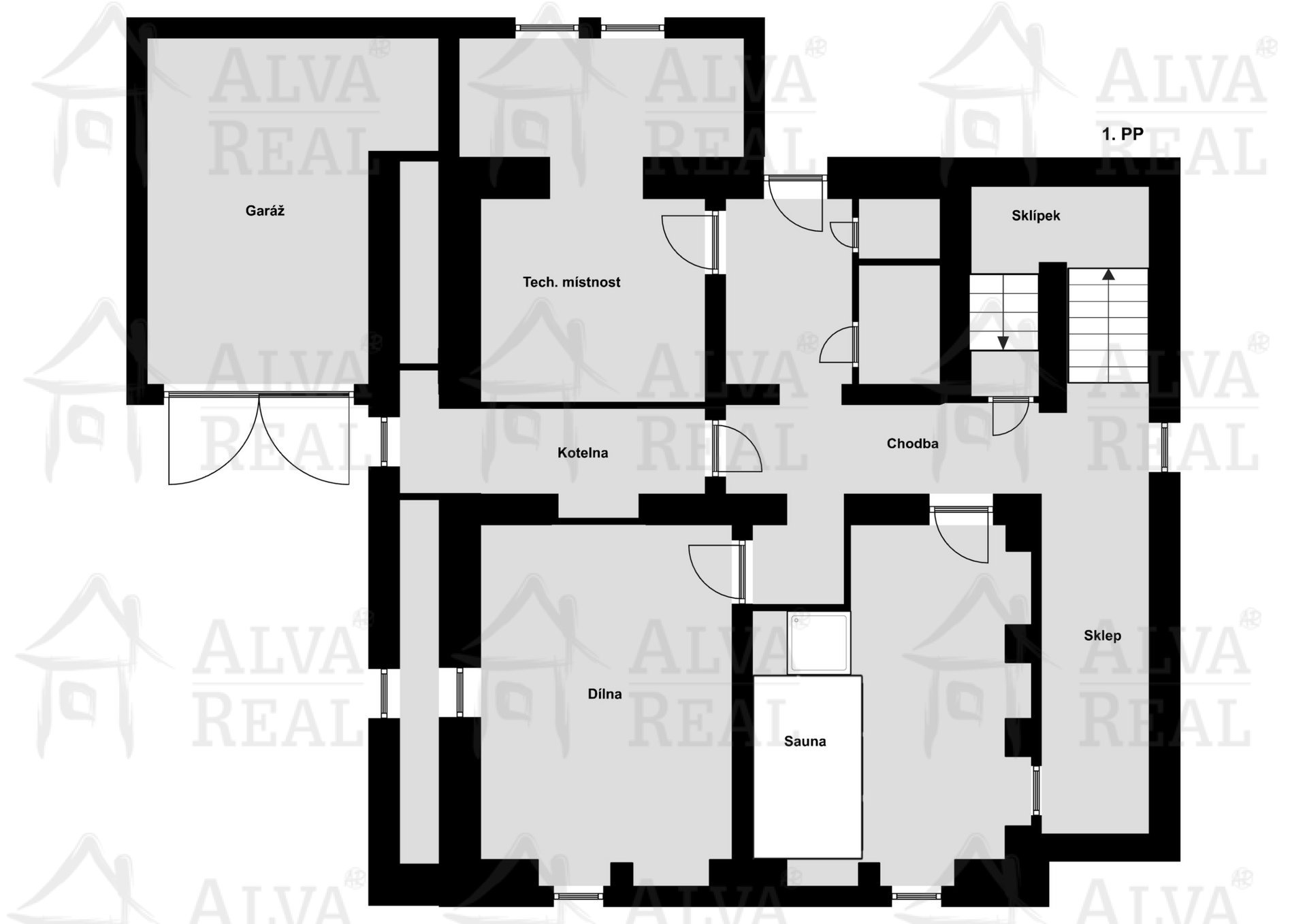 1. PP: sklep zeleninový, místnost se saunou a sprchou, dílna s přípojkou na 380 V, technická místnost, místnost s okny směrem do zahrady.