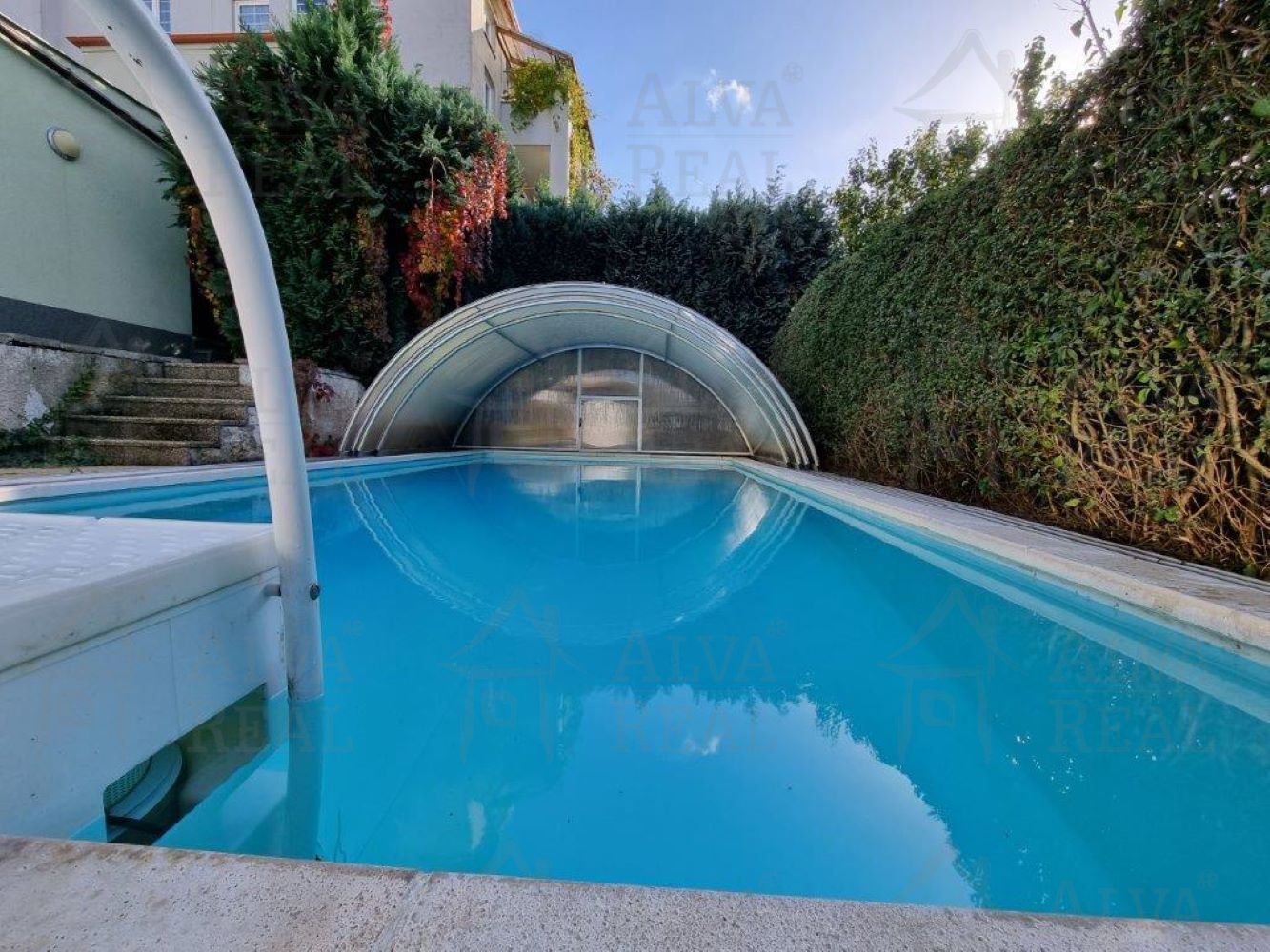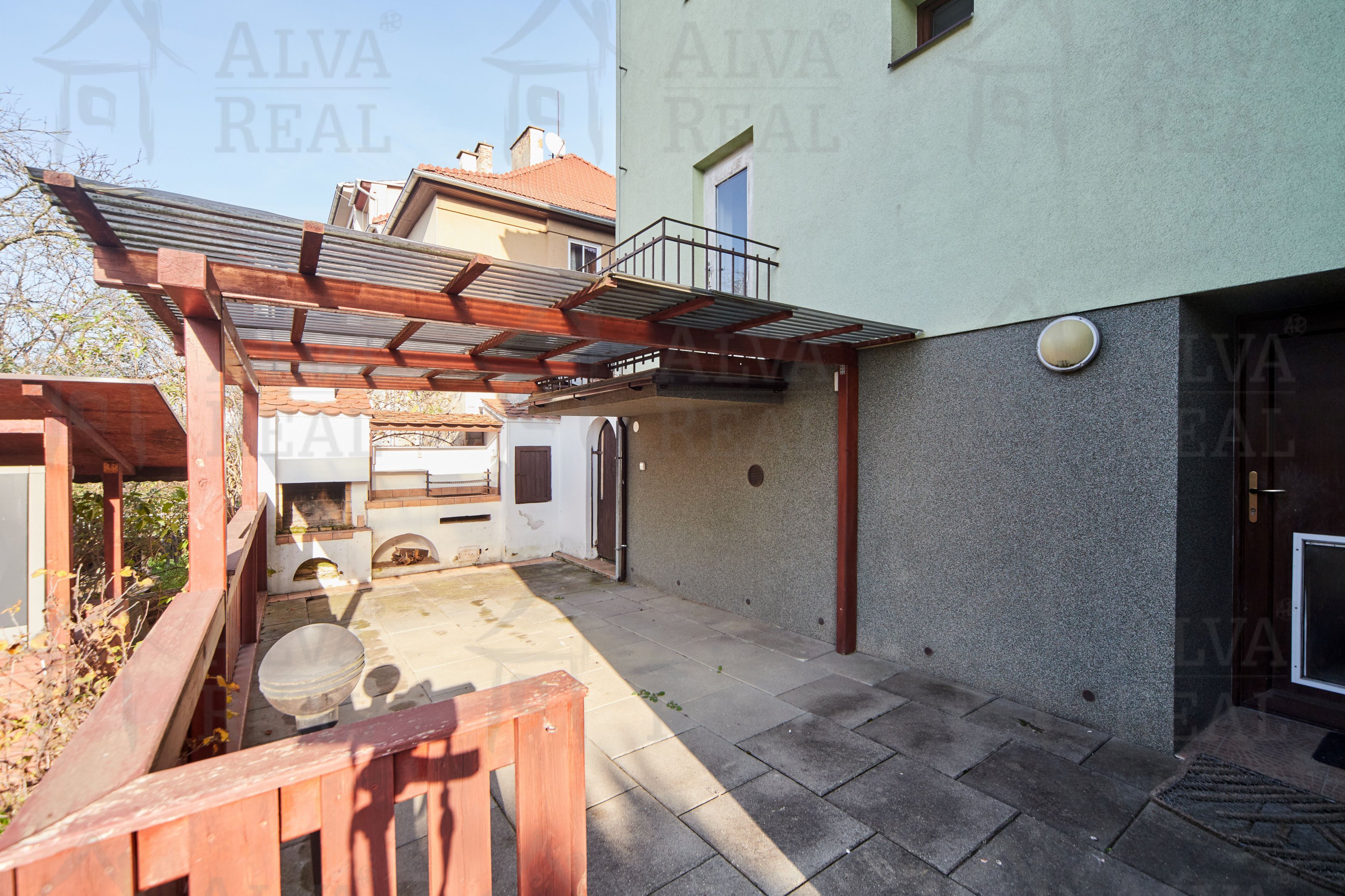 Exteriér domu nabízí zastřešenou pergolu s letní kuchyní včetně krbu, grilu a udírny. Celoročně vytápěný bazén se zastřešením. Zásobník na dešťovou vodu 1 m³. Vzrostlý živý plot poskytující soukromí na zahradě. Členění oplocení přizpůsobeno oddělenému pohybu hlídacího psa, zateplená bouda. Prostorná dvojgaráž s dálkovým el. ovládáním vrat a brány.