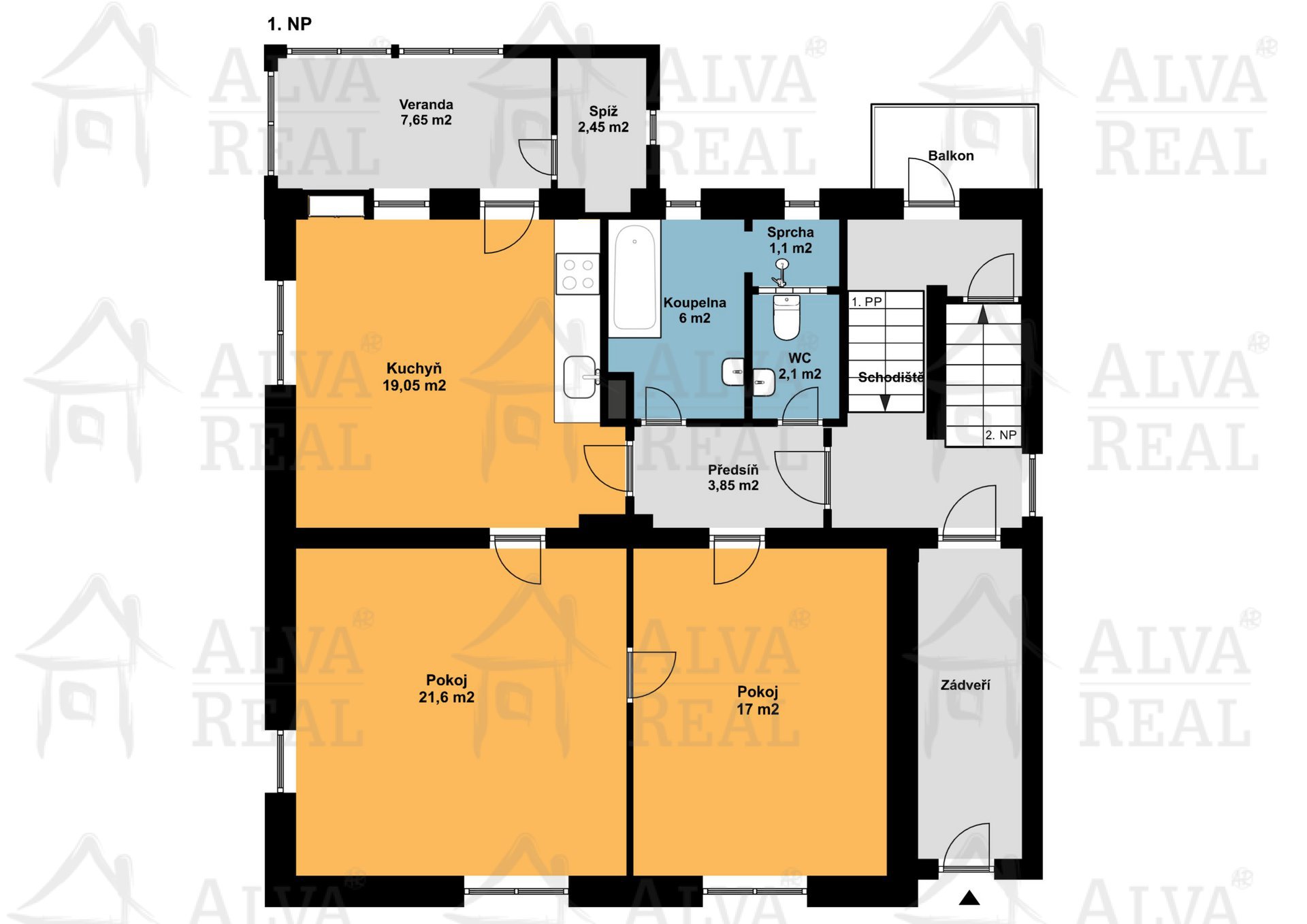 1. NP: současně byt 2+1: v pokojích parkety; kuchyně s kuchyňskou linkou a plyn. sporákem, digestoř; zimní zahrada; spíž; koupelna se zděným sprchovým koutem, příprava pro pračku, sušičku popř. pro vanu; samostatné WC.