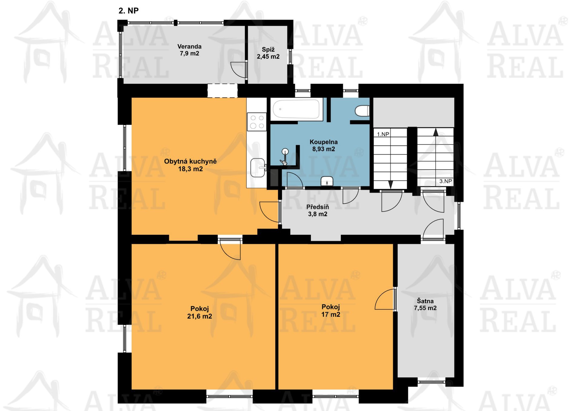 2. NP: současně byt 3+1: 2 neprůchozí pokoje + 1 průchozí pokoj, všechny s parketami a kobercem; kuchyně s kuchyňskou linkou a plynovou varnou deskou, příprava pro myčku; koupelna s WC, sprchou a vanou; zimní zahrada; spíž.