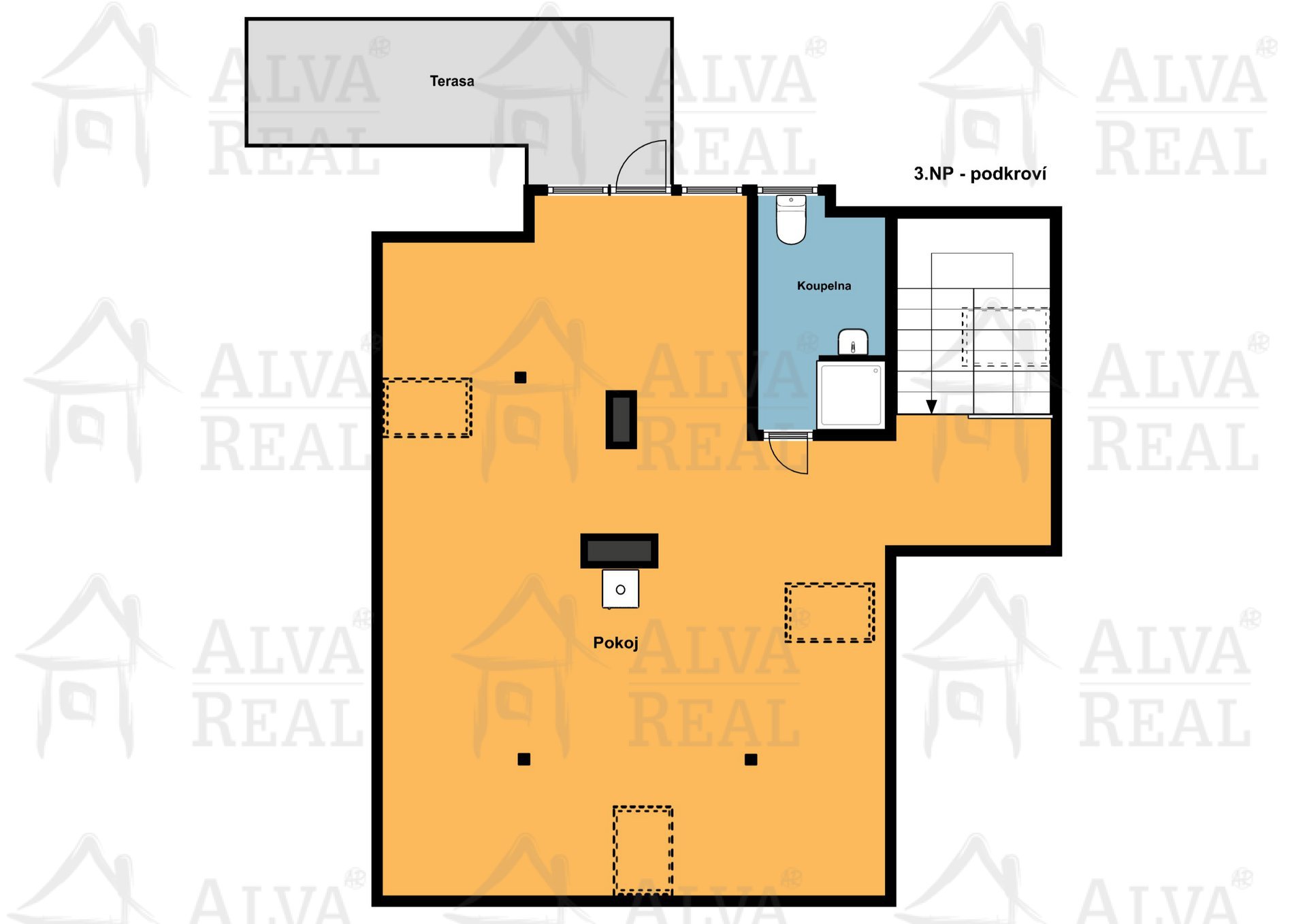 3. NP: podkrovní byt: krbová kamna; koupelna se sprchou a WC; prostor pro umístění kuchyňské linky; střešní terasa, která díky své poloze zajištuje i soukromí před pohledy s okolí.