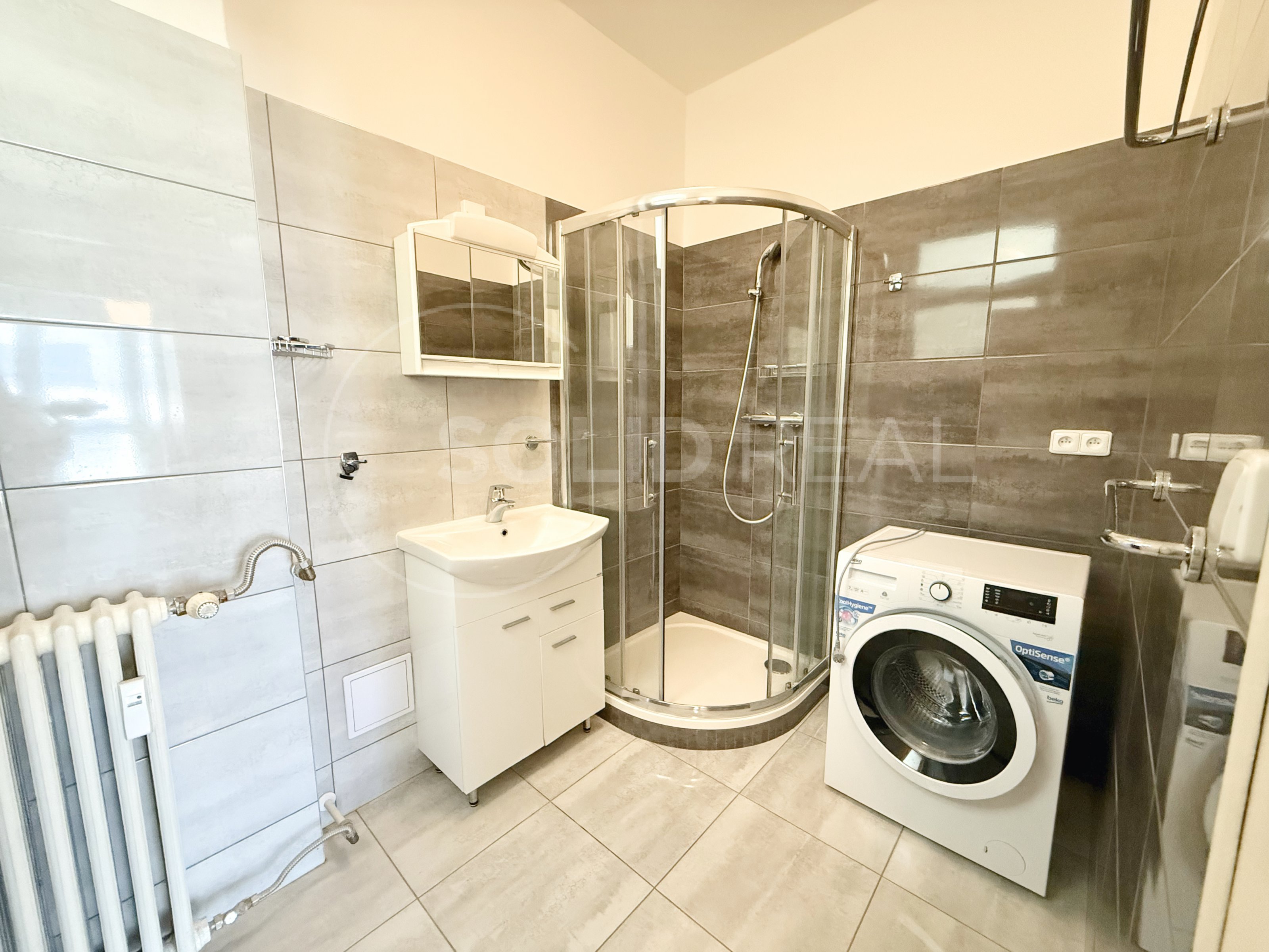 Vybavení: Moderní kuchyňská linka se spotřebiči (myčka, trouba, plynová varná deska), prostorná koupelna se sprchovým koutem a pračkou.