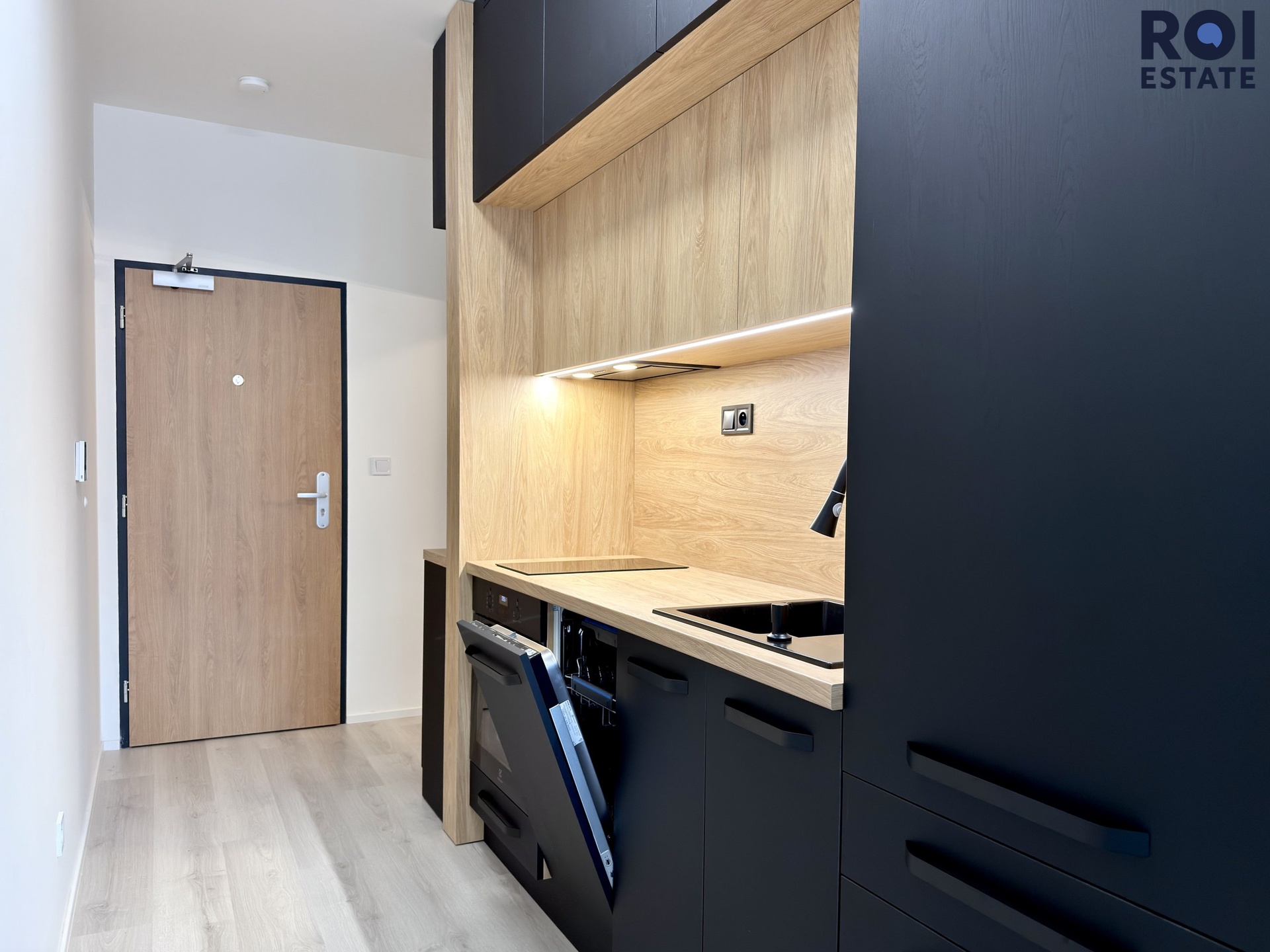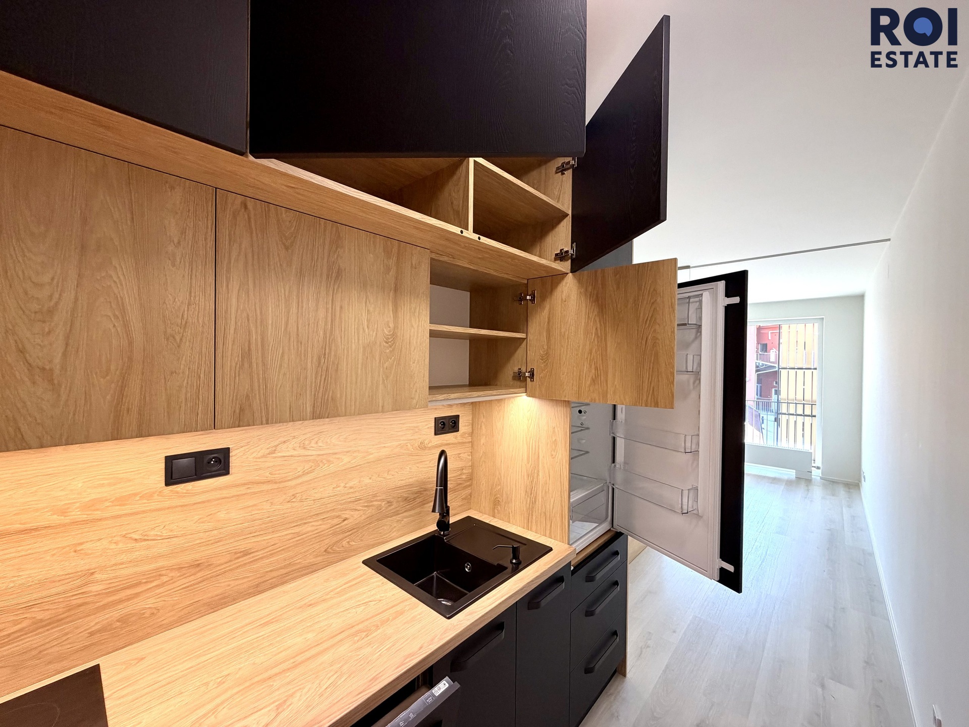 Interiér je moderní a vzdušný. Obytný prostor je chytře rozdělen elegantní skleněnou stěnou, která dodává bytu styl a zároveň zachovává dostatek světla. Kuchyňská linka je vyrobena na míru, je plně vybavena vestavěnými spotřebiči značky Electrolux ( trouba, indukční varná deska, digestoř, myčka).