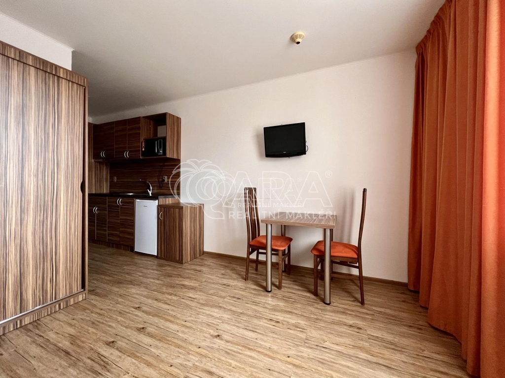 Jedná se o kompletně zrekonstruovanou jednotku, která se nachází ve 2. NP cihlového domu s výtahem. Skládá se z předsíně, která je vybavena předsíňovou skříní s botníkem. Také se zde nachází i menší kuchyňská linka, vybavená lednicí s mrazákem, pečící mikrovlnnou troubou s grilem a přenosným jednoplotýnkovým vařičem. Z předsíně se dostaneme do obytné části, která je zařízena jídelním stolem s židlemi, komodami, rozkládací postelí s matracemi a menší televizí. Koupelna je přístupná z předsíně a je vybavena sprchovým koutem, umyvadlem, skříňkou pod umyvadlem a WC.