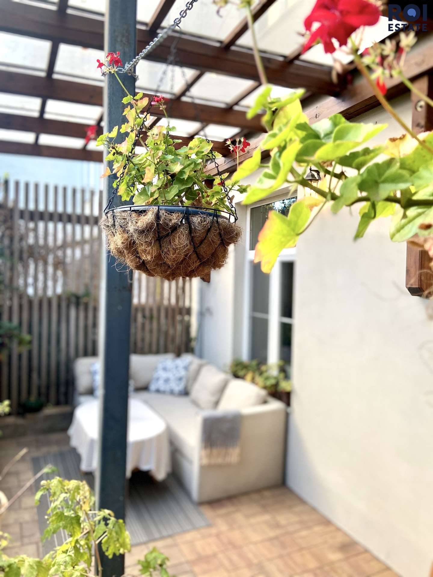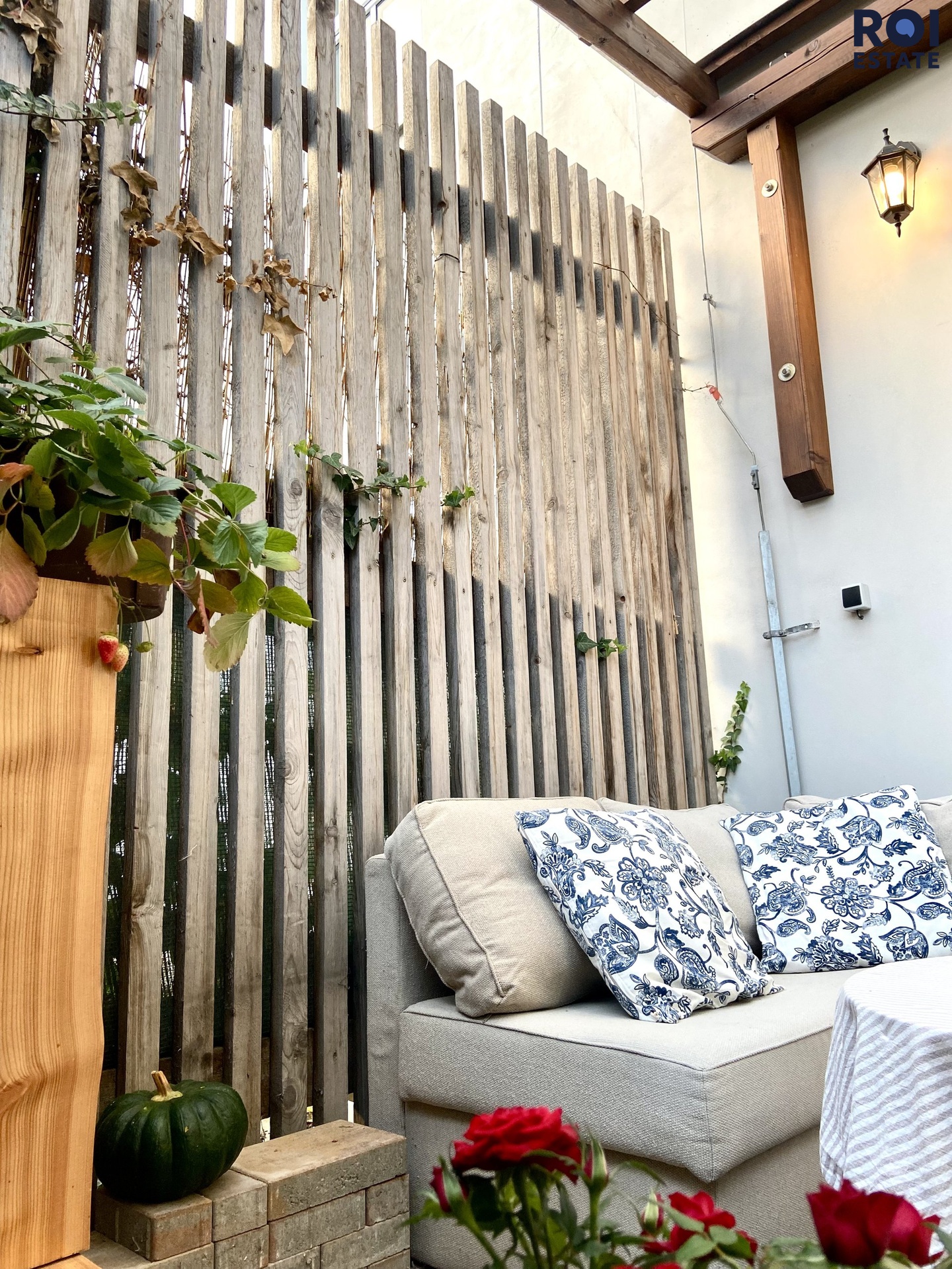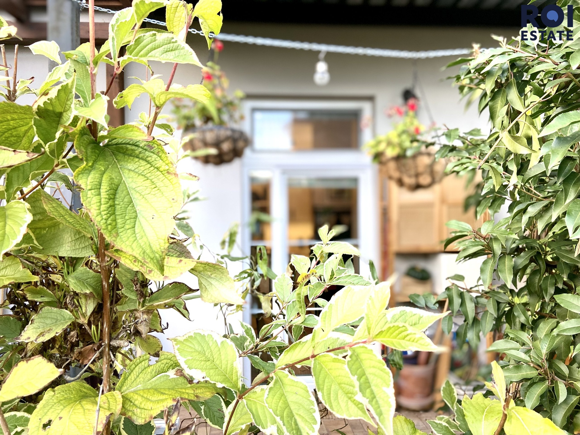 Francouzským oknem se z kuchyně dostaneme přímo na terasu, která je oddělena od zahrady vzrostlými keři, je zastřešena, osvětlena a zařízena dřevěným regál, sedačka rohová, konferenční stolek lze ji využít celoročně. Opravdu oáza, na kterou navazuje upravená zahrada, kterou je možné také využívat. Rozloha venkovních částí 20m2 terasa + 340m2 zahrada.
