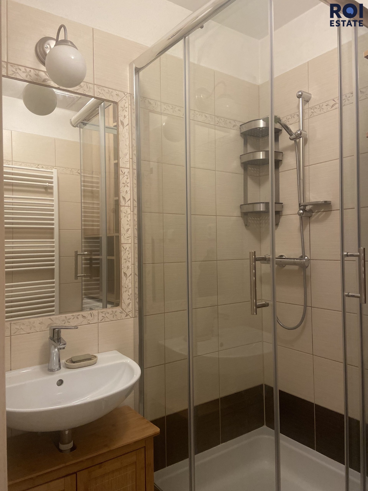 Koupelna se sprchovým koutem, vestavěná skříň, pračka Bosch a plynový kotel Baxi. Toaleta samostatně.