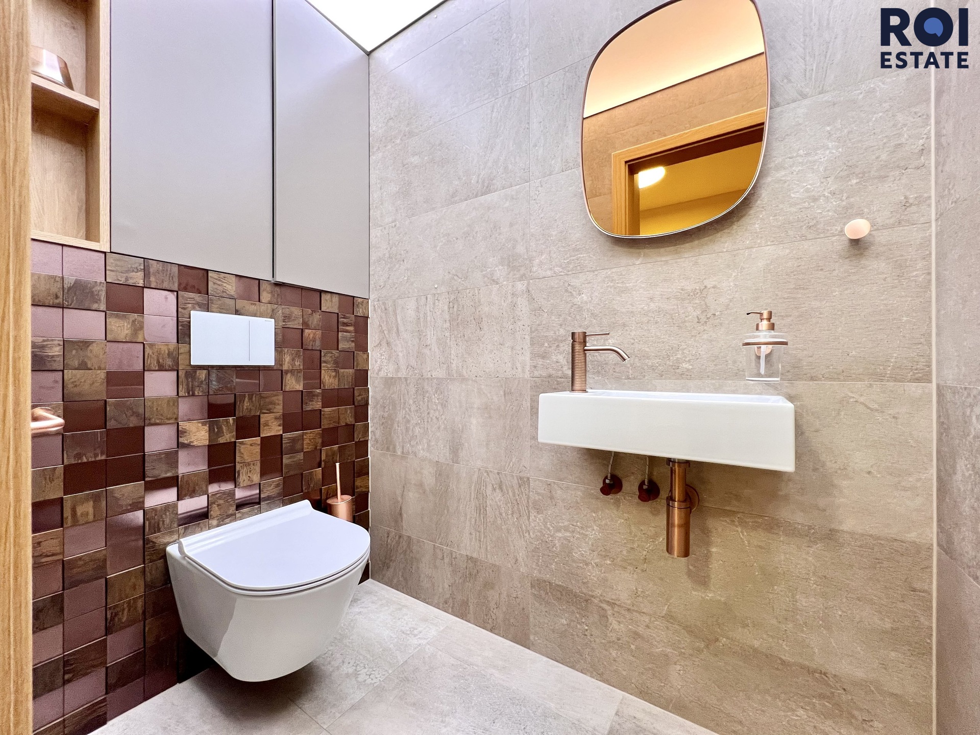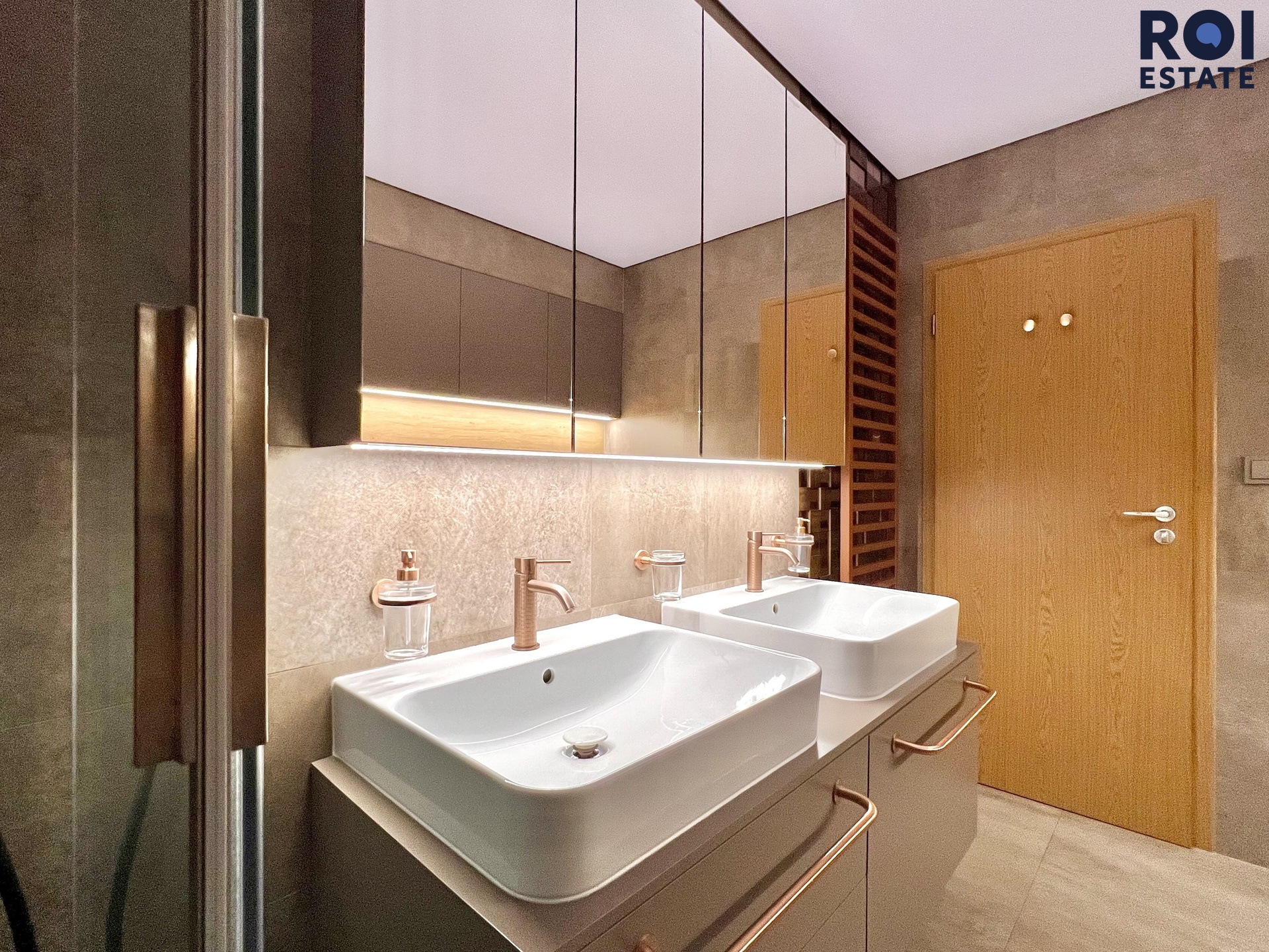 Koupelna a WC: Koupelna vybavena designovými obklady, elegantním řešením osvětlení ve stropě, zážitkovou sprchou, vestavěnou pračkou i sušičkou. Součástí koupelny jsou také dvě umyvadla nebo například bidet i WC. Součástí bytu je taktéž ještě jedna oddělená toaleta.