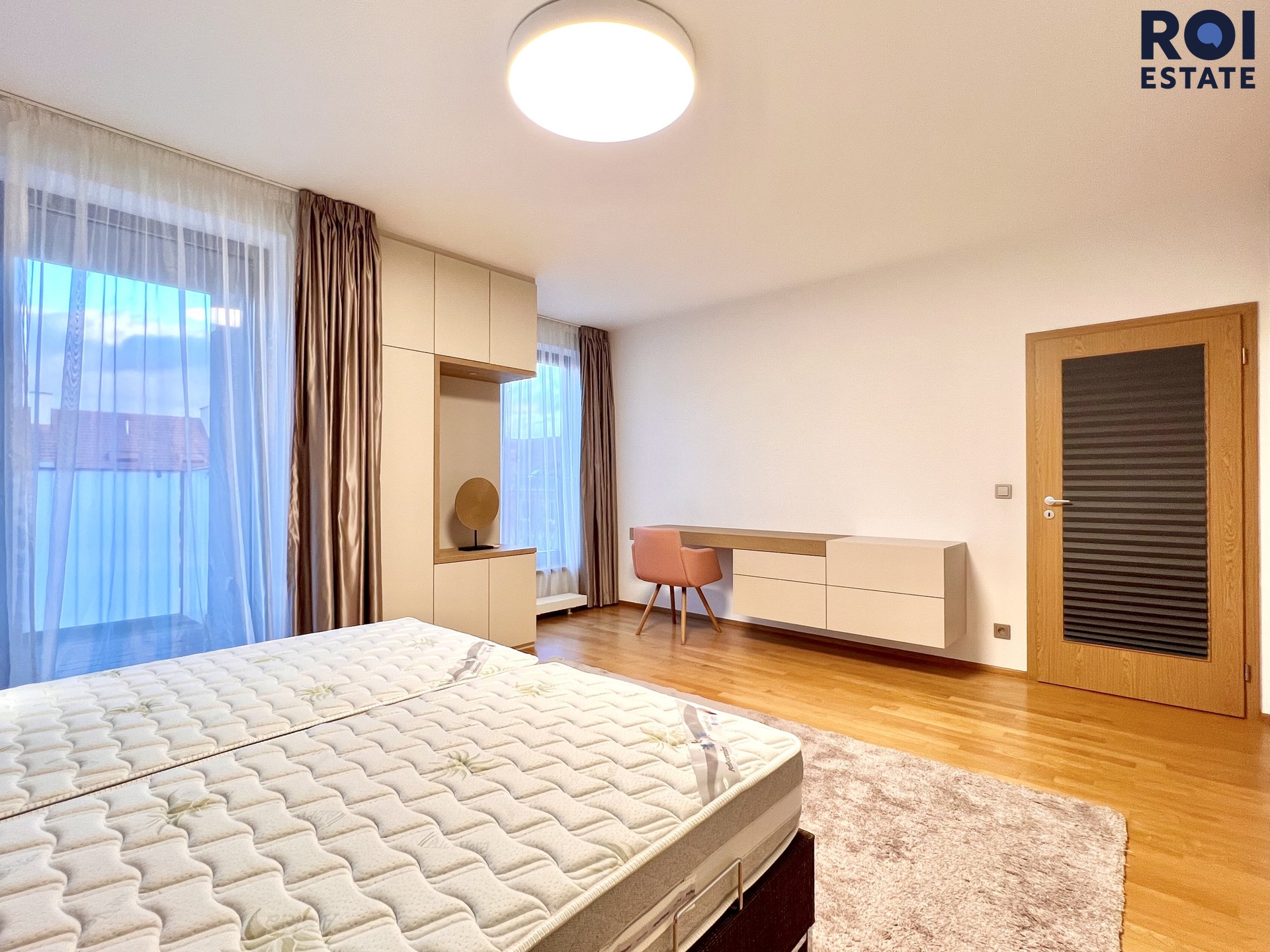 1. Ložnice: vybavena manželskou postelí vč. kvalitní matrace a vestavěného nábytku. Bezpochyby největší výhodou ložnice je oddělená šatna navržená firmou Woodface, která k ní náleží a menší soukromý balkon.