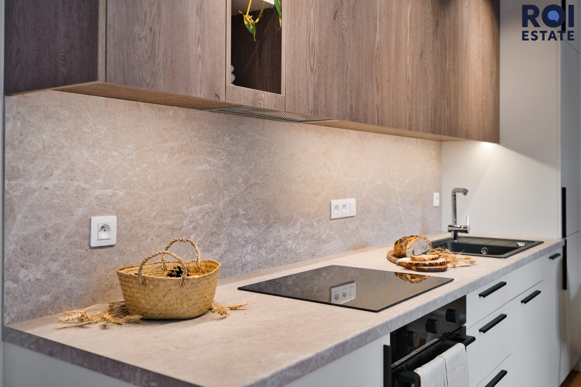 Designová kuchyně: Plně vybavená spotřebiči (myčka, trouba, varná deska, lednice s mrazákem).