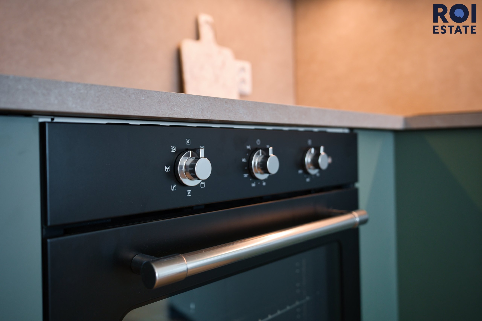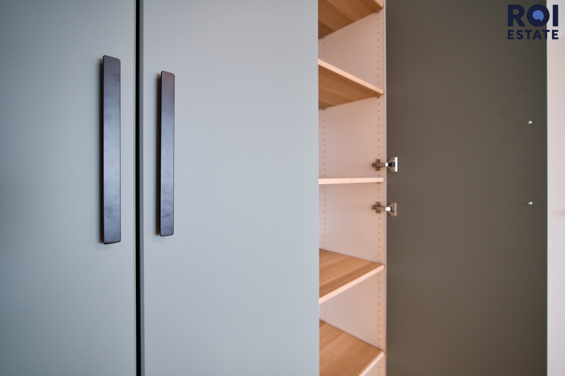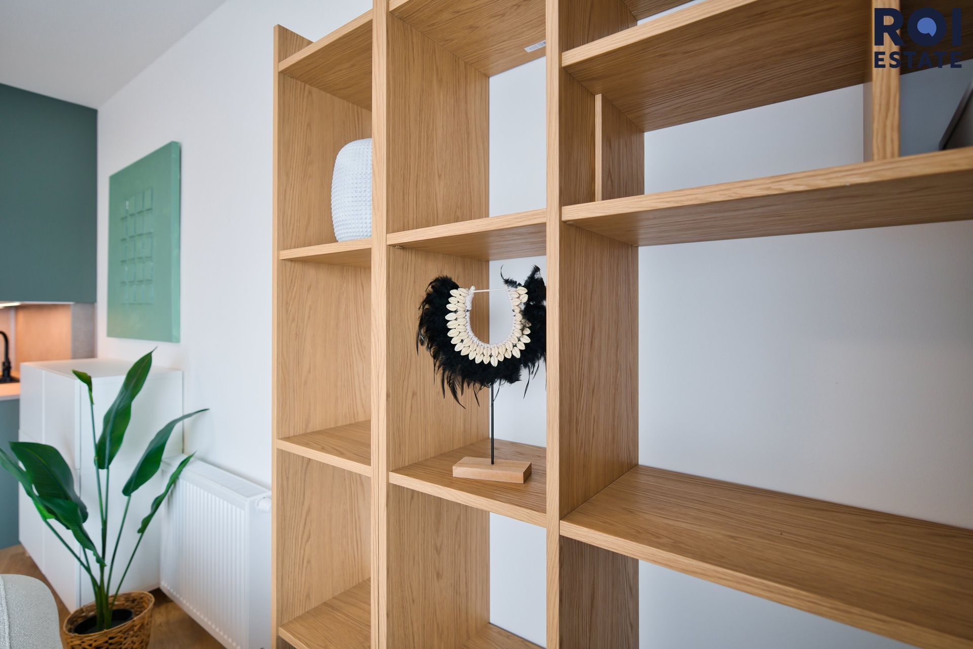 Vybavení bytu: vstupní chodba s úložným prostorem a předsíňovou stěnou, samostatná toaleta, koupelna se sprchovým koutem, pračkou a sušičkou; ložnice s kvalitní postelí, úložnými prostory, šatní skříní a stylovou tapetou; obývací pokoj s moderní kuchyňskou linkou na míru (olivová a cihlová terakota), jídelní kout, světlá sedací souprava, knihovna, stylové osvětlení