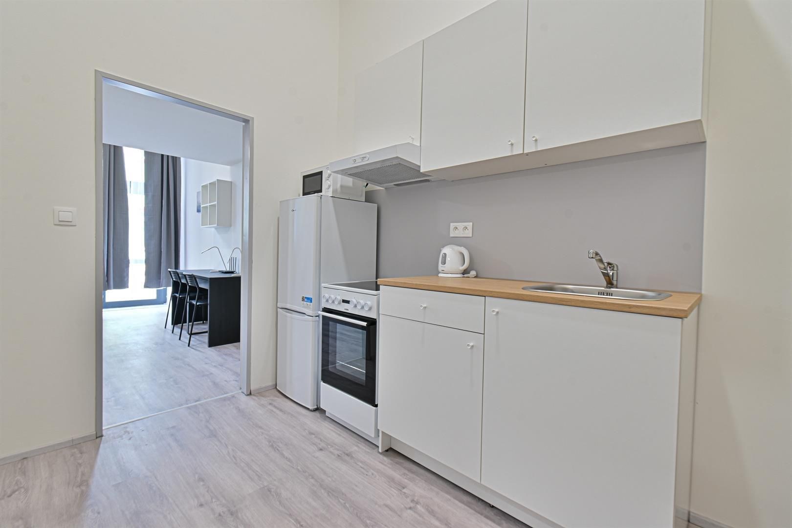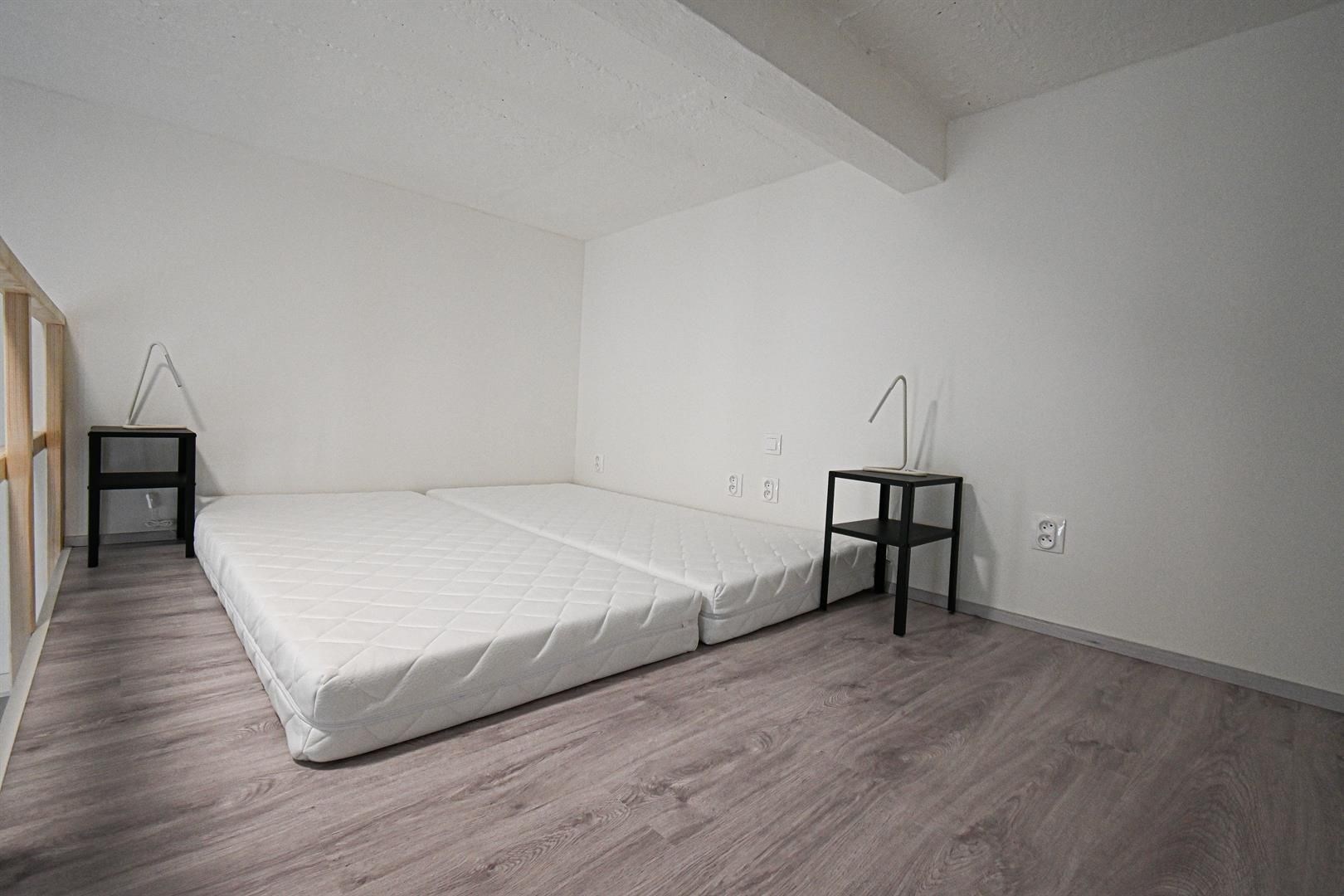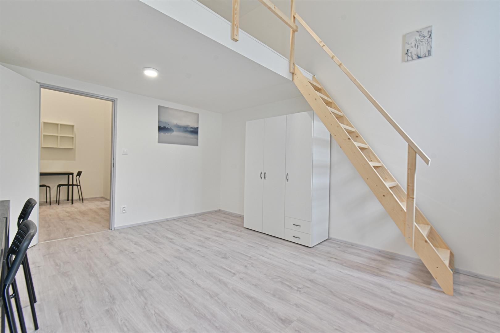 Jedná se o podnájem kompletně vybavené jednotky o dispozici 1+kk v nově zrekonstruovaném domě. V jednotce se nachází oddělená kuchyně od ložnice. Součástí je plně zařízený kuchyňský kout včetně lednice, mikrovlnné trouby, varné konvice, sklokeramické desky, digestoře a dřezu. Pokoj je vybaven dvěma pracovními stoly se židlemi, mezonetovým spaním pro dvě osoby s nočními stolky a prostornou skříní. Koupelna nabízí sprchový kout, záchod a umyvadlo se zrcadlem. K dispozici je příprava pro připojení vlastní pračky.