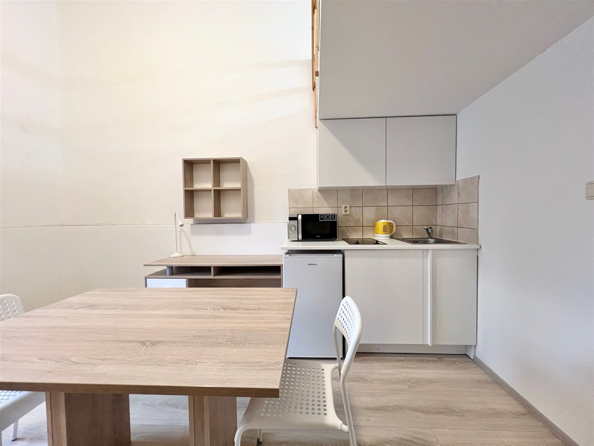 Jedná se o podnájem kompletně vybavené jednotky o dispozici 1+kk ve zrekonstruovaném domě. Součástí vybavení kuchyně je plně zařízený kuchyňský kout včetně lednice, mikrovlnné trouby, varné konvice, sklokeramické desky, digestoře a dřezu. Jednotka je vybavena dvěma pracovními stoly s židlemi, mezonetovým spaním s nočními stolky a dvoudveřovou skříní. Koupelna je také plně vybavená, a to sprchovým koutem, záchodem a umyvadlem se zrcadlem. K dispozici je příprava pro připojení vlastní pračky.