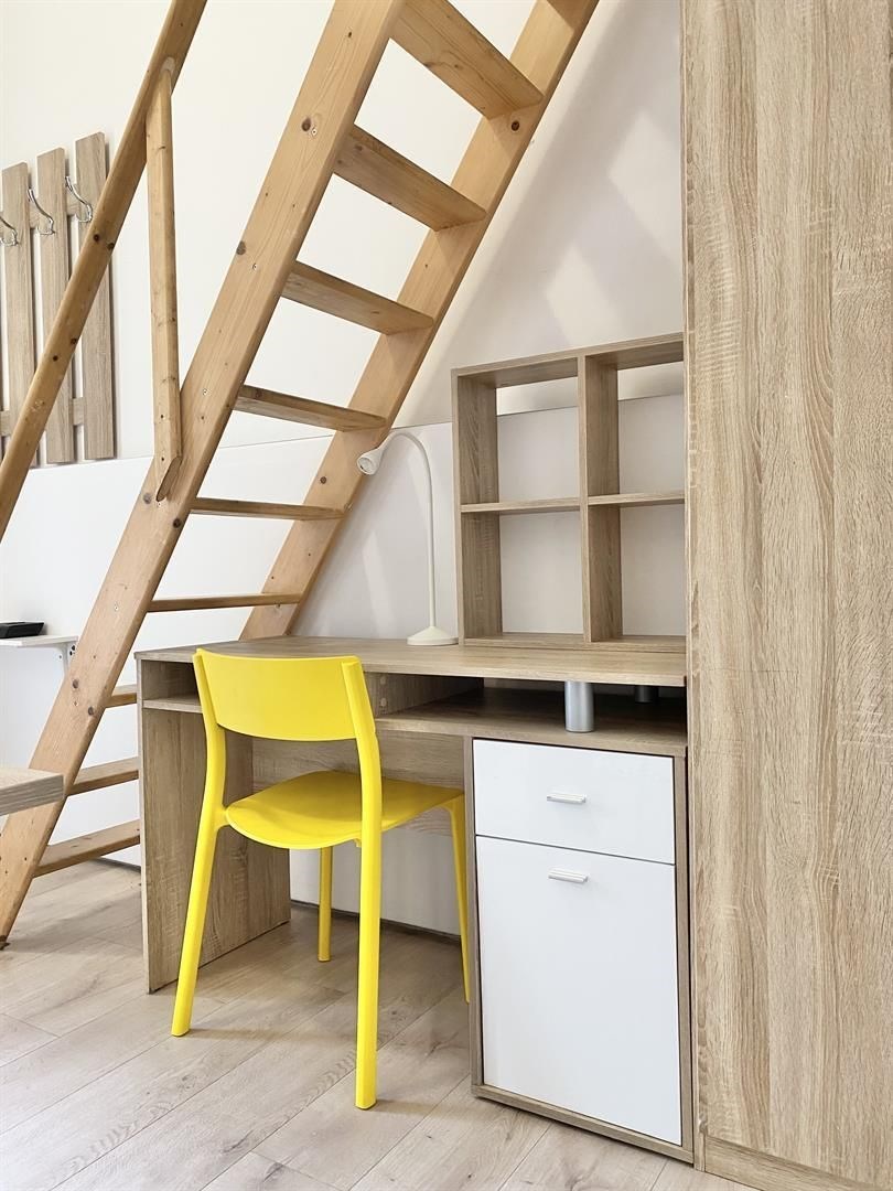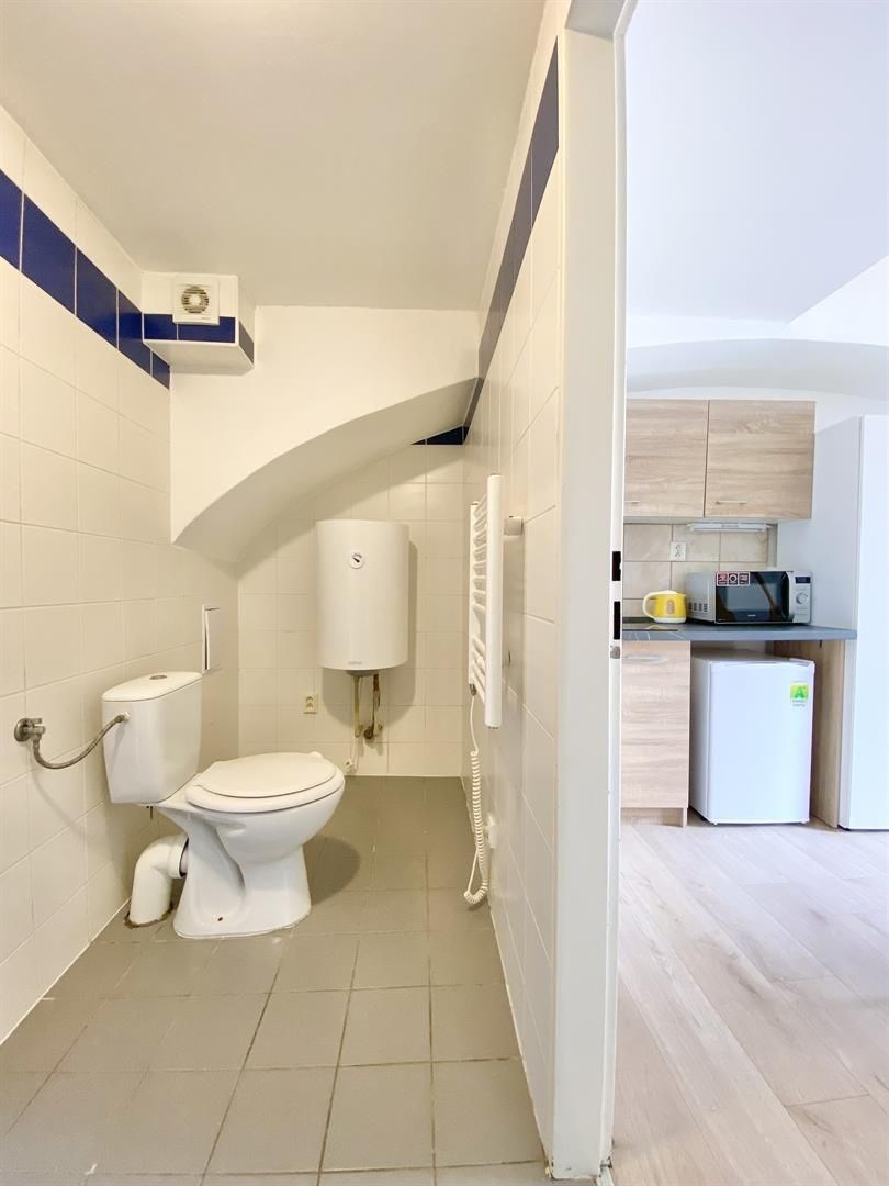 Jedná se o podnájem kompletně vybavené jednotky o dispozici 1+kk v nově zrekonstruovaném domě. Součástí vybavení kuchyně je plně zařízený kuchyňský kout, včetně lednice, mikrovlnné trouby, sklokeramické desky, digestoře a dřezu. Jednotka je vybavena dvěma pracovními stoly s židlemi, mezonetovým spaním s nočním stolkem a dostatečným prostorem na ukládání oblečení. Koupelna je také plně vybavená, a to sprchovým koutem, záchodem a umyvadlem se zrcadlem. K dispozici je příprava pro připojení vlastní pračky.