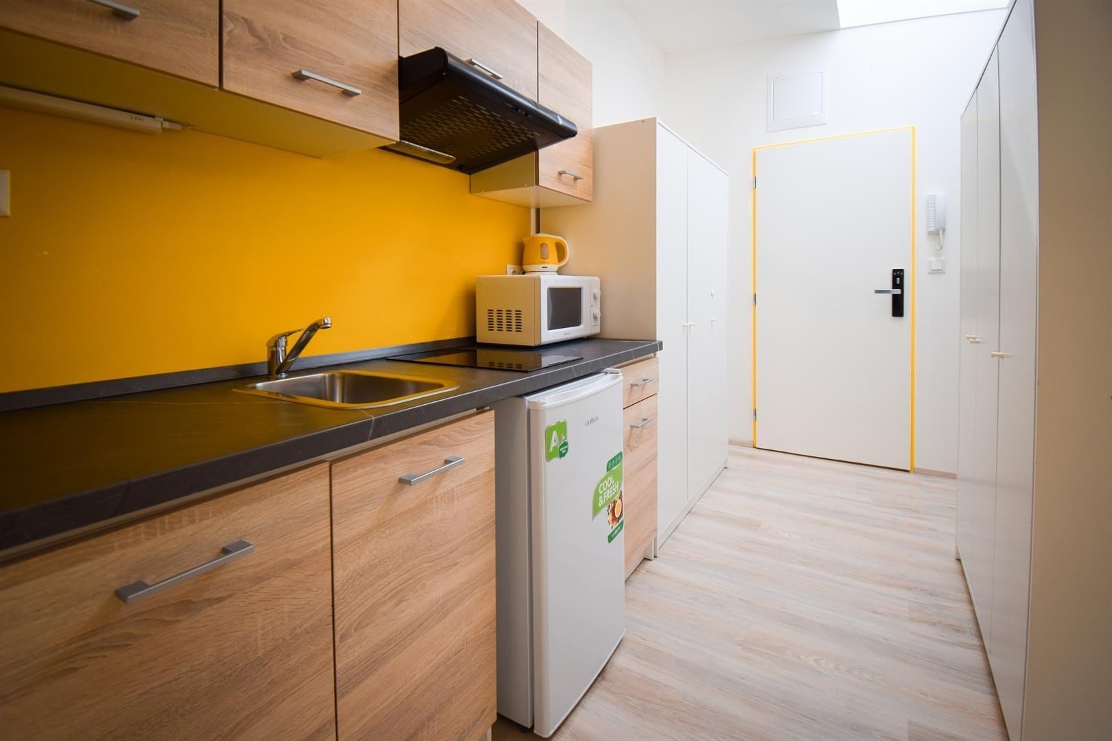 Jedná se o podnájem kompletně vybavené jednotky o dispozici 2+1 v nově zrekonstruovaném domě. Součástí vybavení kuchyně je plně zařízený kuchyňský kout včetně lednice, sklokeramické desky, mikrovlnné trouby, rychlovarné konvice, digestoře a dřezu. Jednotka je vybavena dvěma neprůchozími pokoji, každý s pracovními stoly se židlemi, dvěma postelemi s nočním stolkem a prostornou skříní. Koupelna nabízí sprchový kout, záchod a umyvadlo se zrcadlem. K dispozici je příprava pro připojení vlastní pračky.