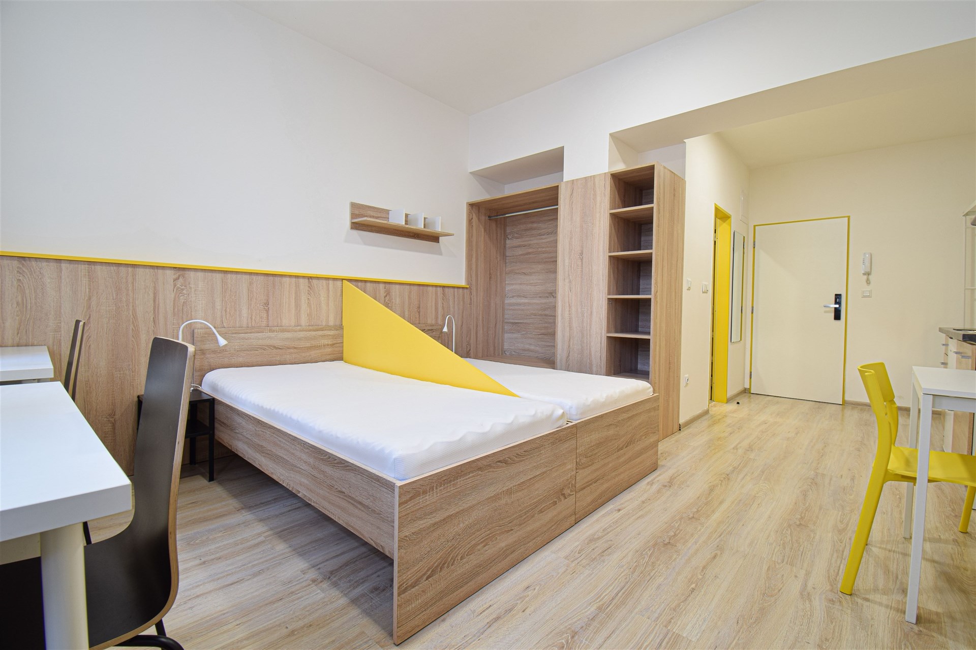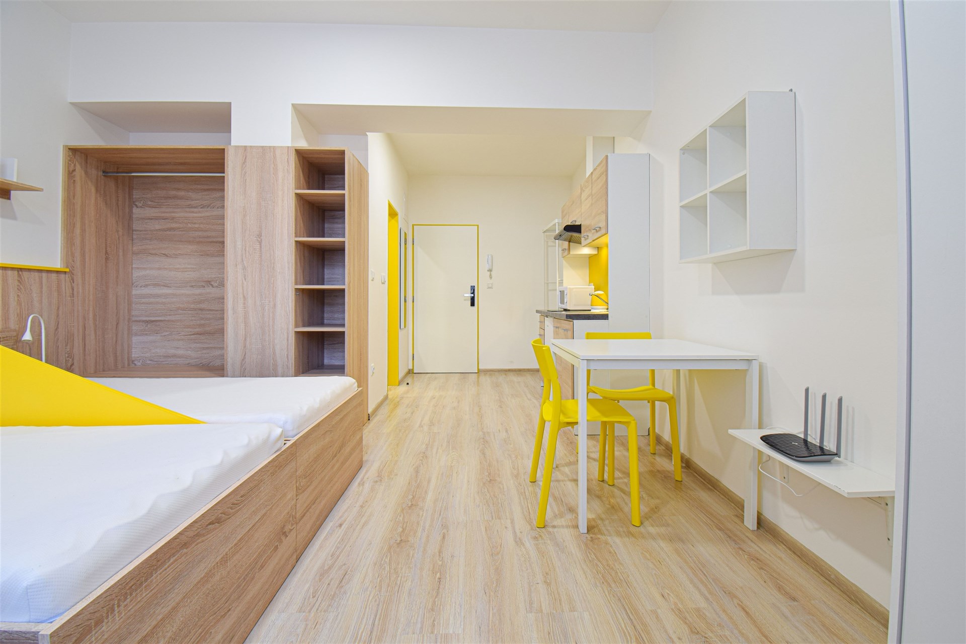 Jedná se o podnájem kompletně vybavené jednotky o dispozici 1+kk v zrekonstruovaném domě. Součástí vybavení kuchyně je plně zařízený kuchyňský kout, včetně lednice, sklokeramické desky, mikrovlnné trouby, varné konvice, digestoře a dřezu. Jednotka je vybavena pracovním stolem se židlemi, dvěma postelemi s nočními stolky a dostatečným prostorem na ukládání oblečení. Koupelna je také plně vybavená, a to sprchovým koutem, záchodem a umyvadlem se zrcadlem. K dispozici je příprava pro připojení vlastní pračky.